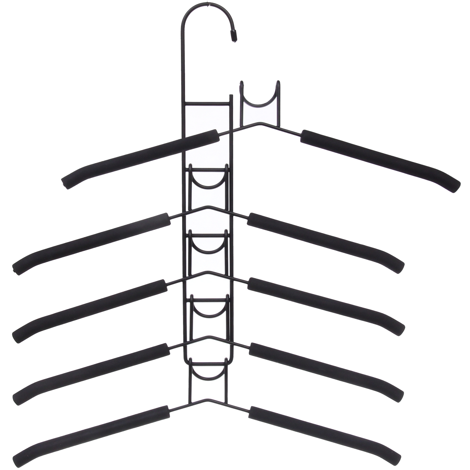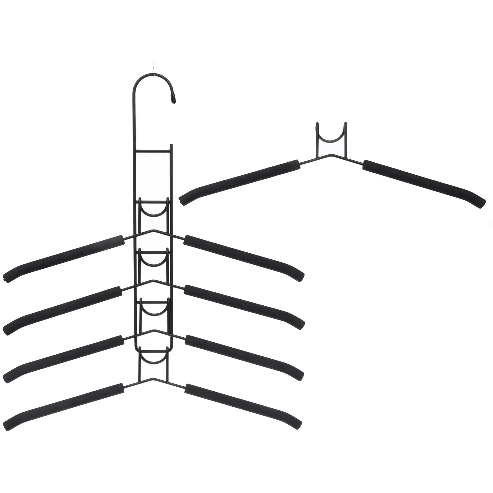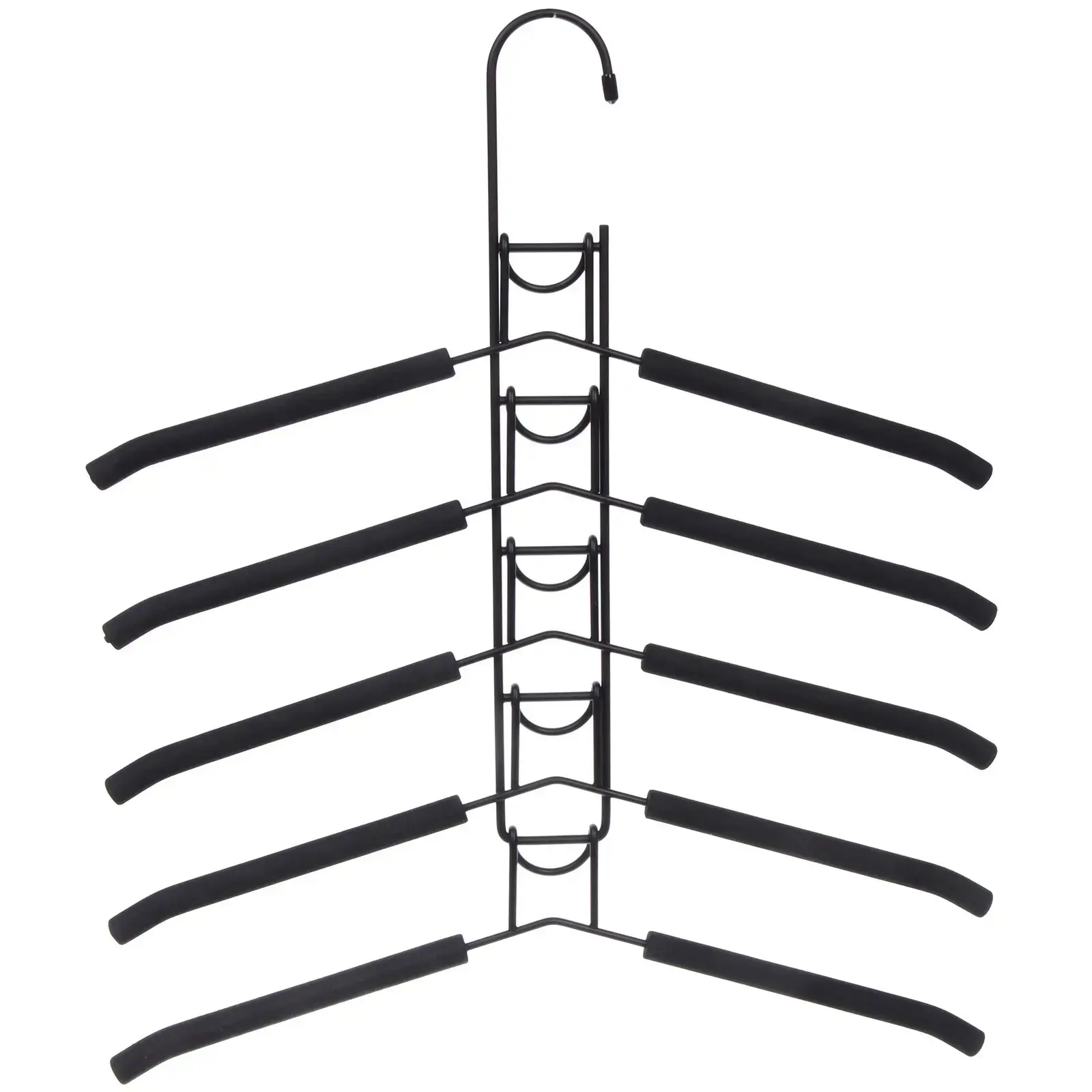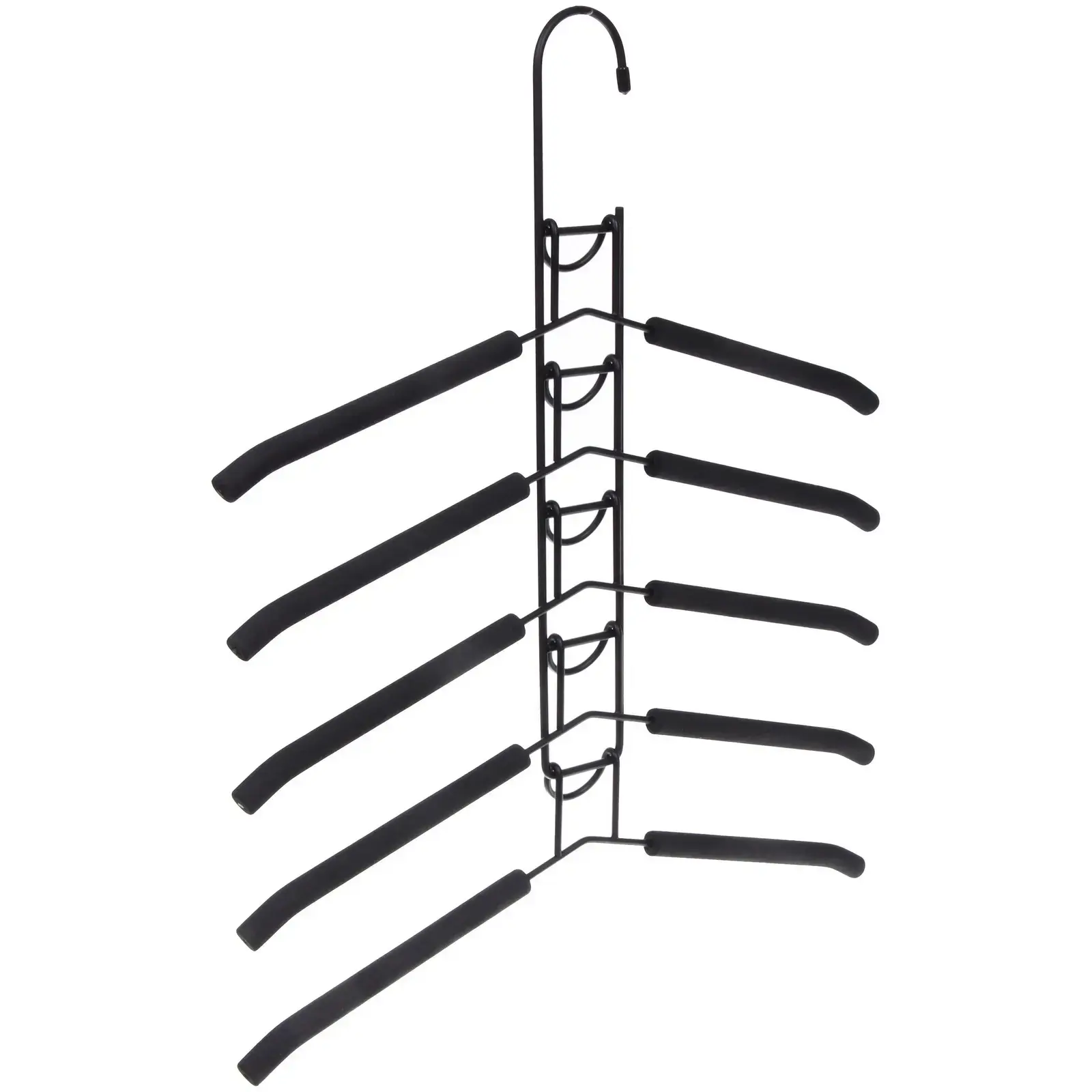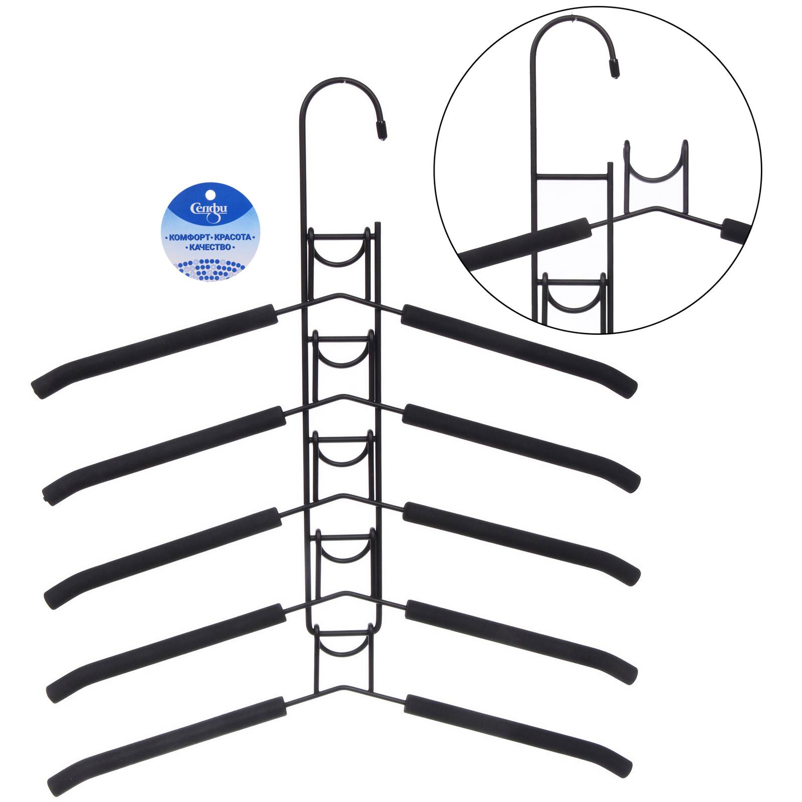 Эта вешалка предназначена для размещения нескольких предметов одежды одновременно. С пятью горизонтальными перекладинами, она обеспечивает удобный доступ к вашим вещам и помогает поддерживать порядок в шкафу. Верхняя часть вешалки оснащена крючком, что позволяет легко подвешивать её на штангах шкафа или в гардеробе.