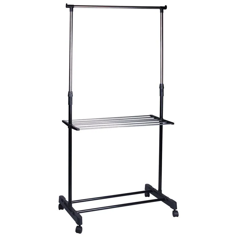 Главным достоинством данной модели является телескопическая система стоек. Вы можете легко настраивать высоту в диапазоне от 95 до 168 см, что позволяет аккуратно размещать любые предметы гардероба — от коротких рубашек и пиджаков до длинных платьев и пальто. Надежные пластиковые фиксаторы прочно удерживают перекладину на выбранном уровне.