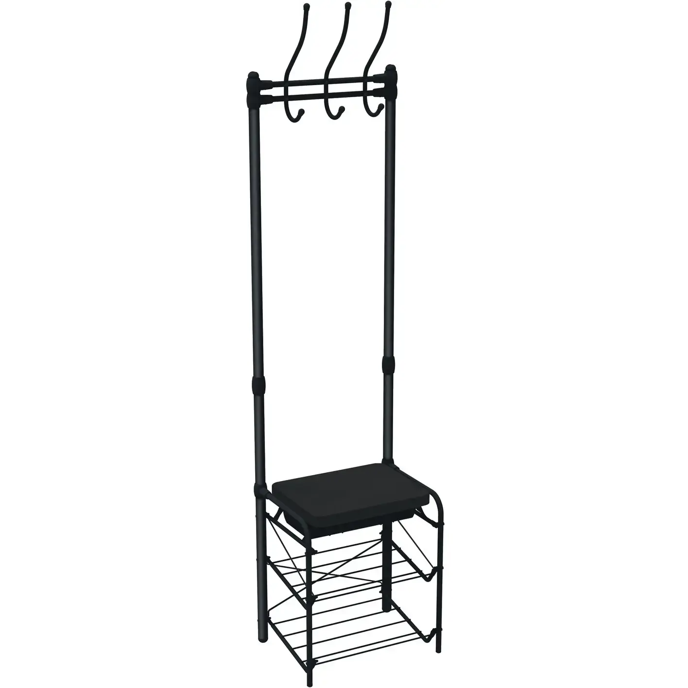 Вешалка предназначена для хранения одежды и обуви, идеально подходит для использования в прихожей или коридоре. Она легко впишется в любой интерьер благодаря своему современному дизайну и черному цвету. Удобные полки внизу позволят разместить обувь или другие аксессуары, а ящик для хранения под сиденьем поможет скрыть мелкие вещи.