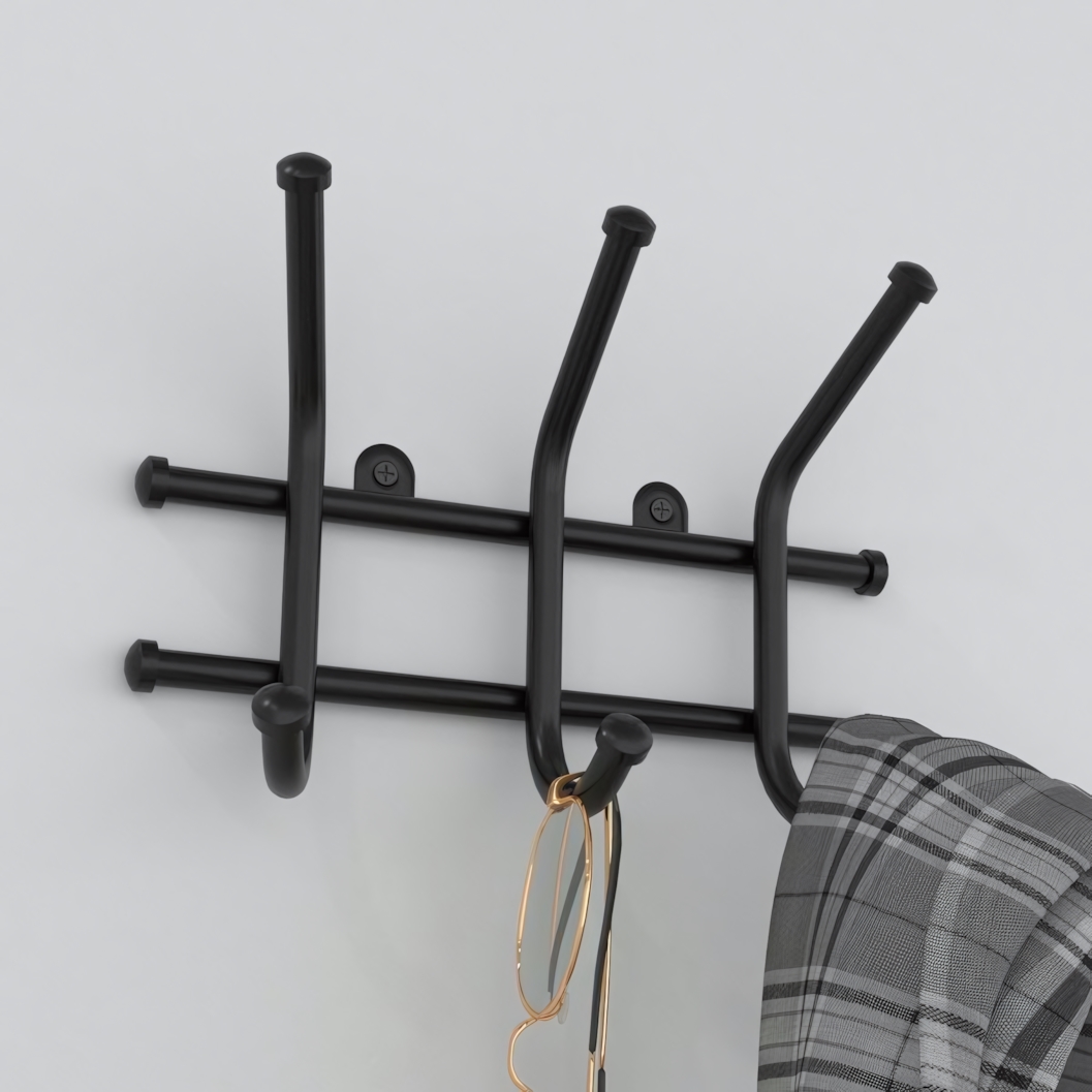 Металлическая вешалка отличается прочностью и устойчивостью к ежедневной нагрузке. Матовая черная поверхность выглядит сдержанно и современно, легко сочетается с мебелью и отделкой разных оттенков. Изделие просто в уходе: достаточно периодически протирать его сухой или слегка влажной тканью.