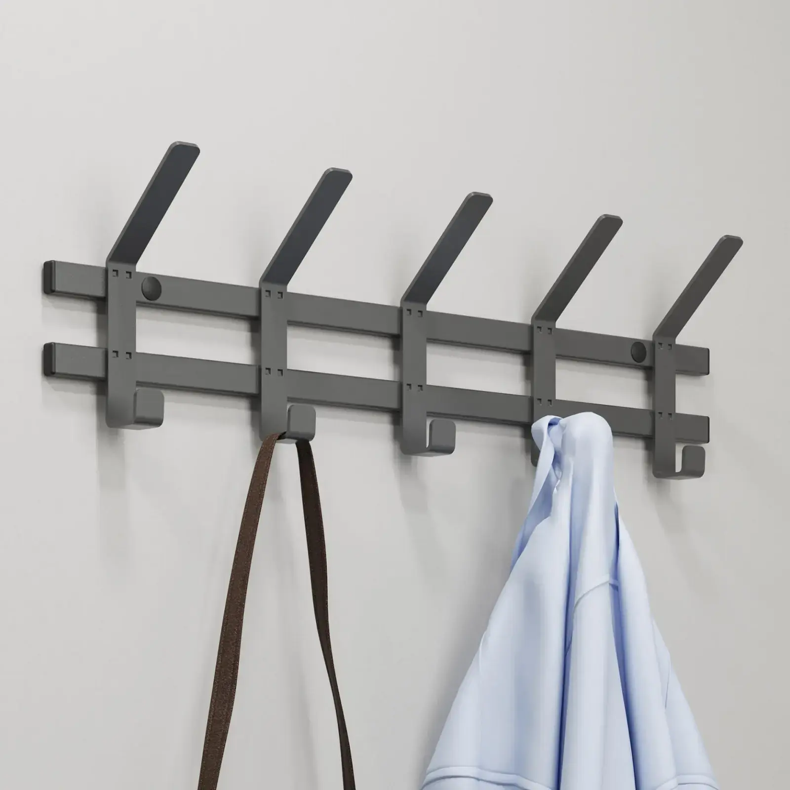 Настенная вешалка «ТОРОНТО 5» в графитовом цвете — это идеальное решение для создания функционального и стильного пространства в вашей прихожей или гардеробной. Она не только украсит ваш интерьер, но и обеспечит удобное хранение верхней одежды и аксессуаров. Благодаря своему современному дизайну в стиле лофт, вешалка легко впишется в любой интерьер, добавляя ему изысканности и практичности.