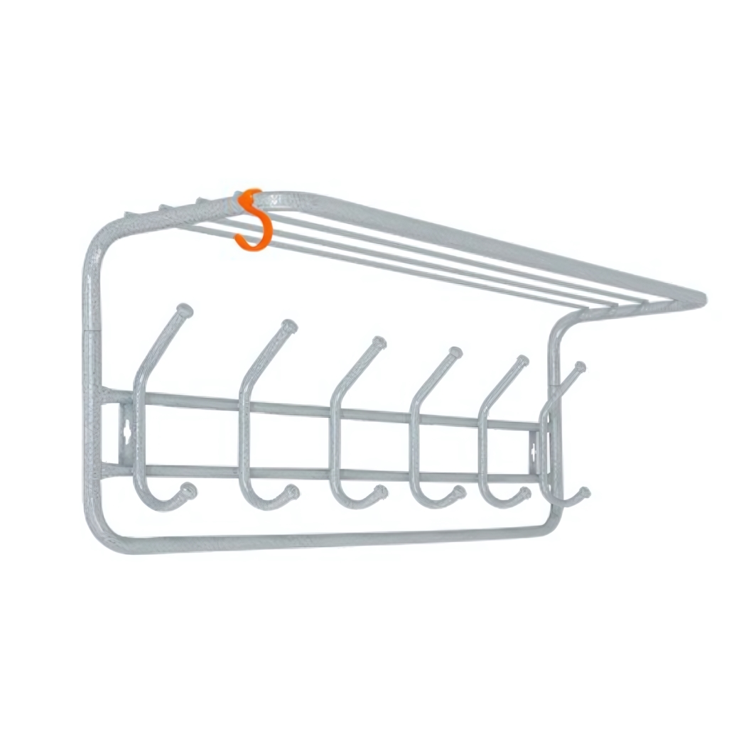 Модель оснащена 6 двойными крючками, которые позволяют одновременно разместить куртки, пальто, сумки или зонты. Допустимая нагрузка до 5 кг на каждый крючок обеспечивает надежное использование в ежедневном режиме. Верхняя полка из металлических прутьев подходит для хранения шапок, шарфов и коробок с мелочами.