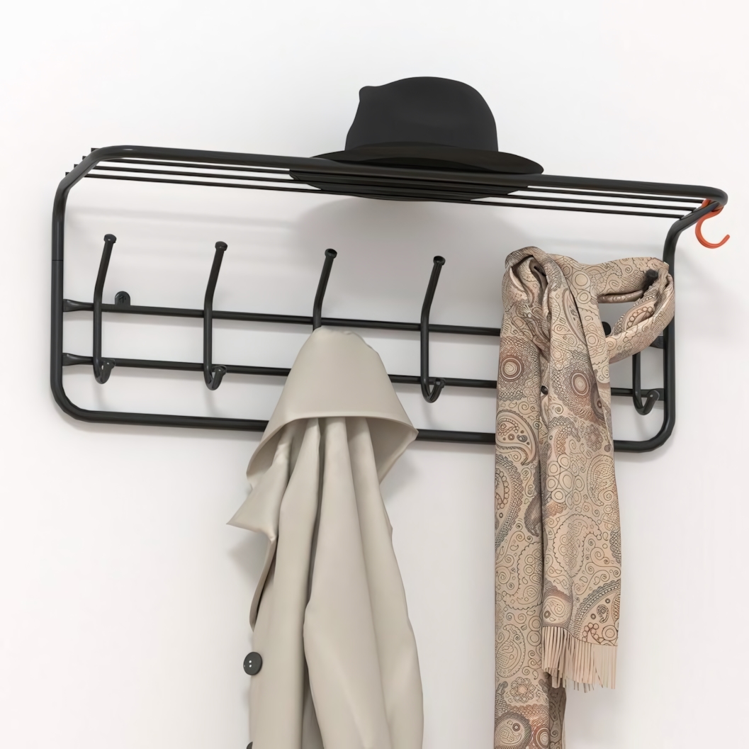 Настенная вешалка с полкой помогает организовать хранение одежды и аксессуаров даже в небольшом пространстве. Компактная конструкция сочетает в себе удобные крючки для верхней одежды и функциональную полку для головных уборов, шарфов и других мелочей. Чёрное исполнение гармонично вписывается в современный интерьер и подчёркивает аккуратность зоны хранения.