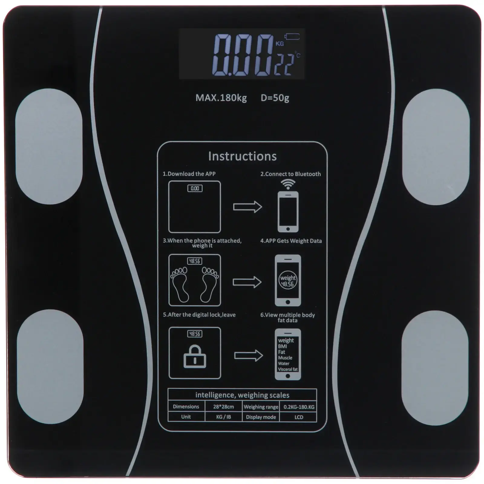 Эти весы могут измерять до 180 кг с делением 50 г, что делает их подходящими для большинства пользователей. Гладкая стеклянная поверхность легко очищается, а стильный черный цвет добавляет элегантности вашему пространству. Весы также имеют функцию умных весов, позволяющую отслеживать различные параметры тела, такие как индекс массы тела (BMI), уровень жира и мышечной массы.