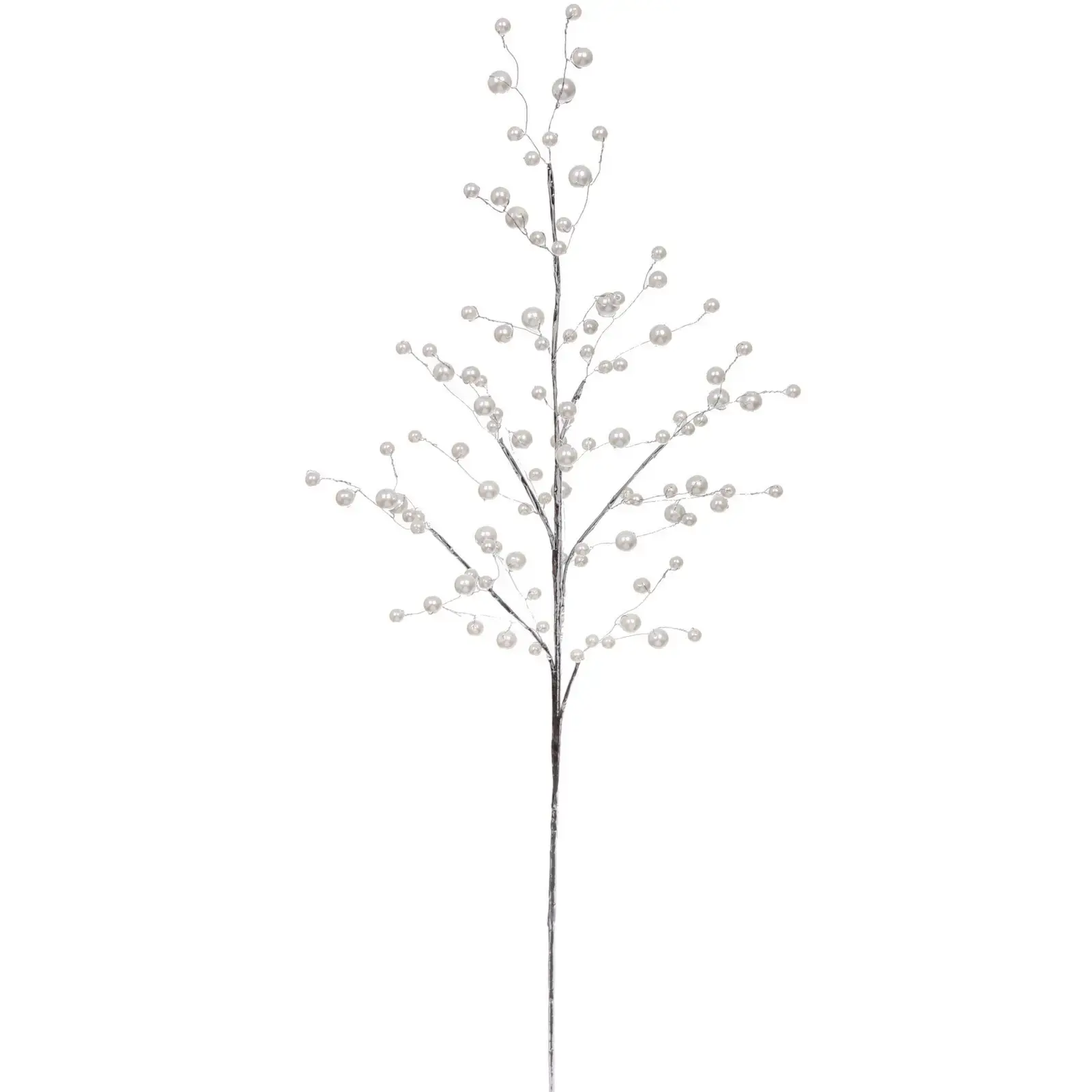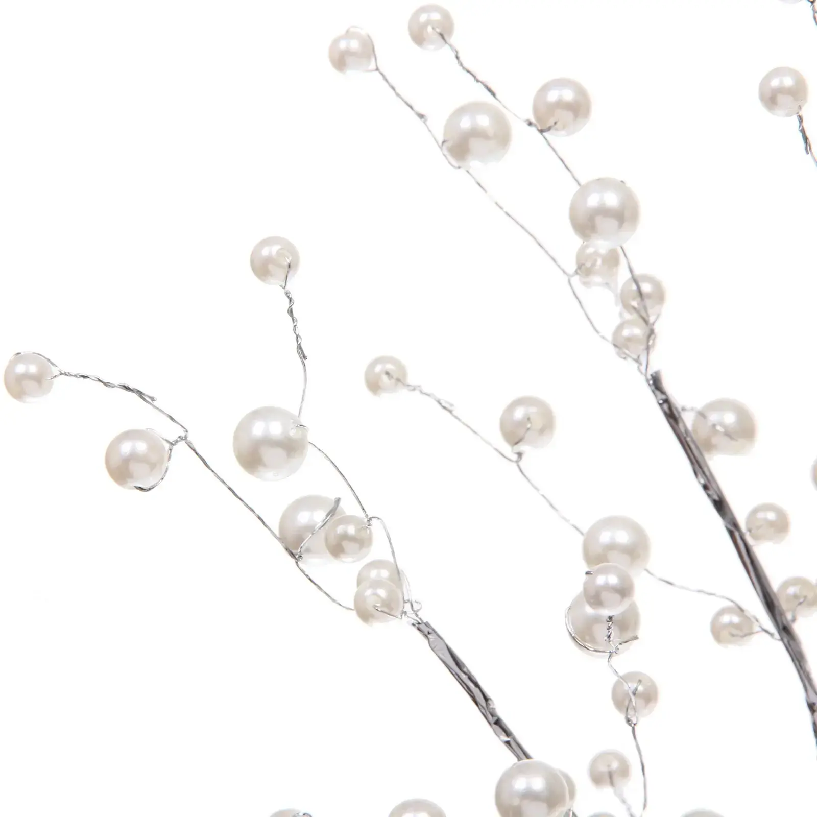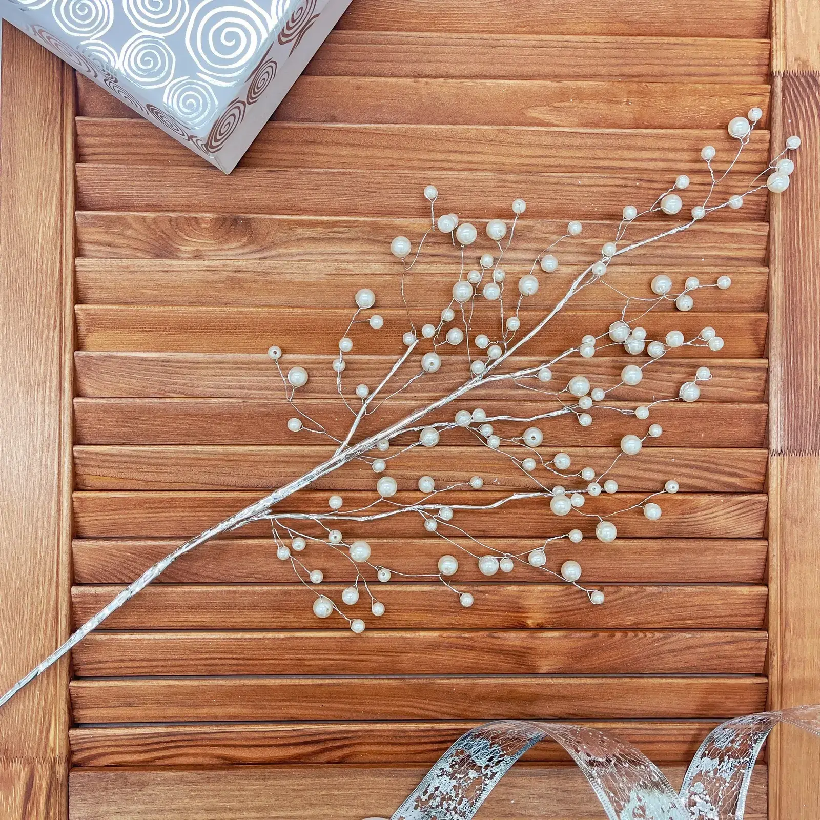 Длина ветки — 80 см, что оптимально для большинства декоративных задач. Серебристый оттенок гармонирует с любыми цветовыми палитрами, а жемчужные элементы диаметром от 5 до 15 мм создают деликатный блеск. Легкий вес (менее 300 г) позволяет крепить композицию на тонкие крючки или ленты.