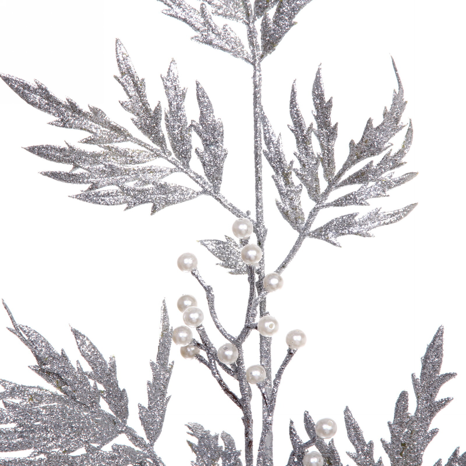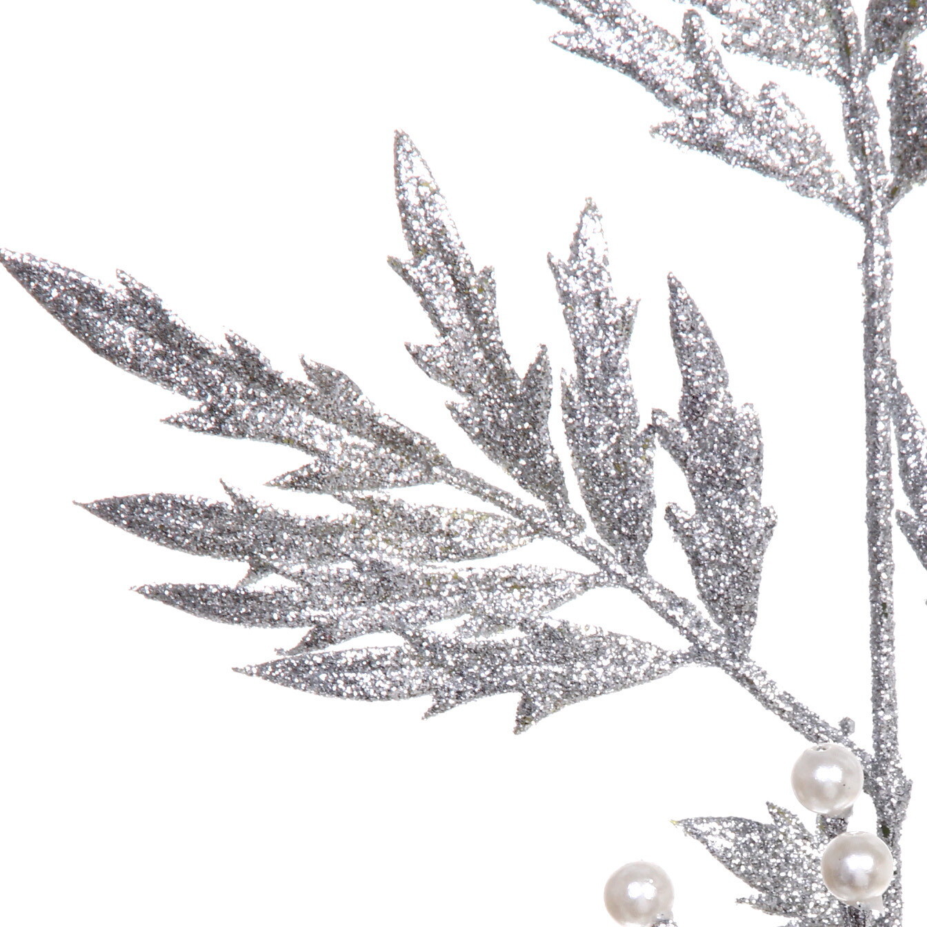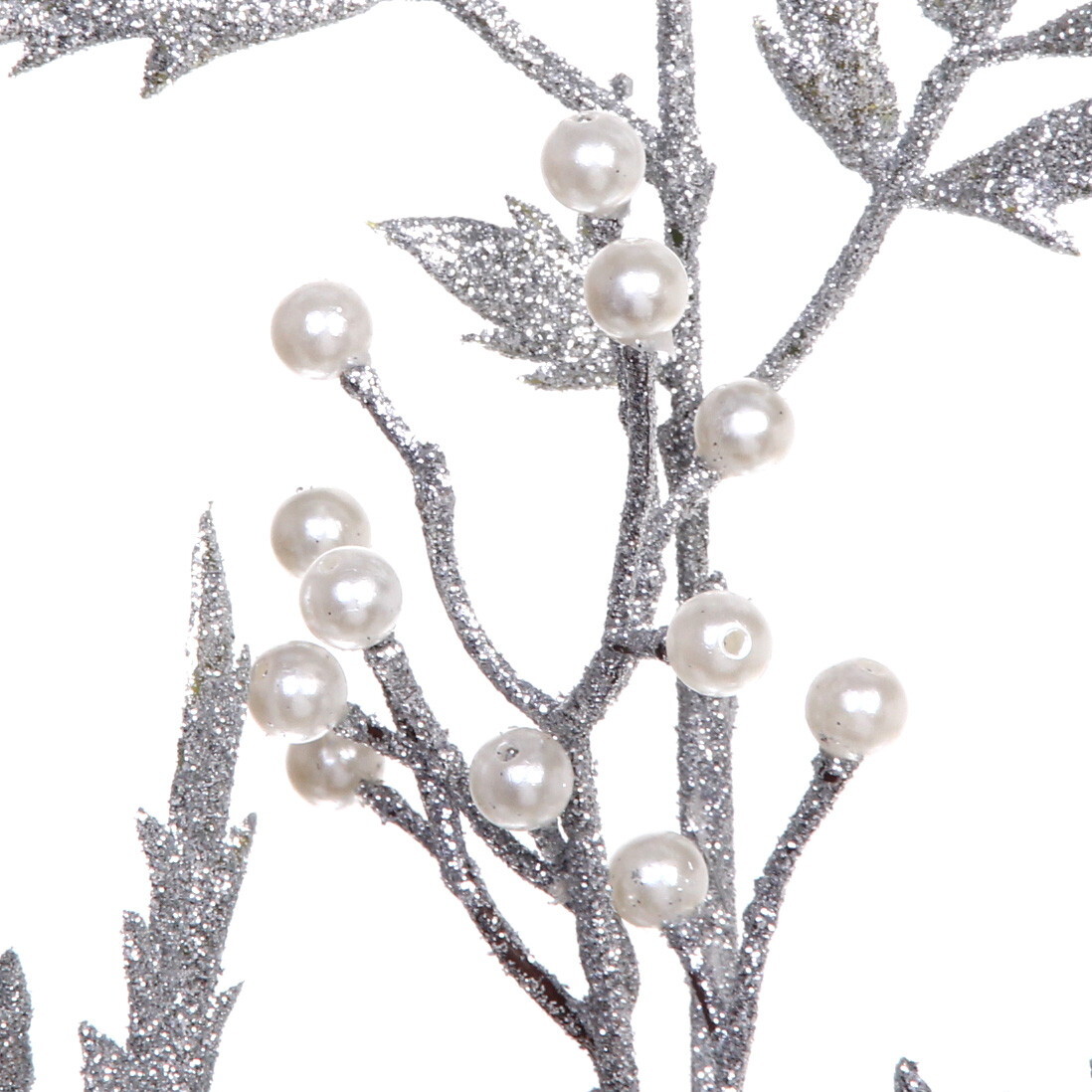 Прочная пластиковая основа сохраняет форму даже при активном использовании. Глиттерное покрытие листьев создает эффект зимнего инея, а жемчужные элементы добавляют благородный акцент. Благодаря компактным размерам (80 см) ветка легко вписывается в любые пространственные решения.