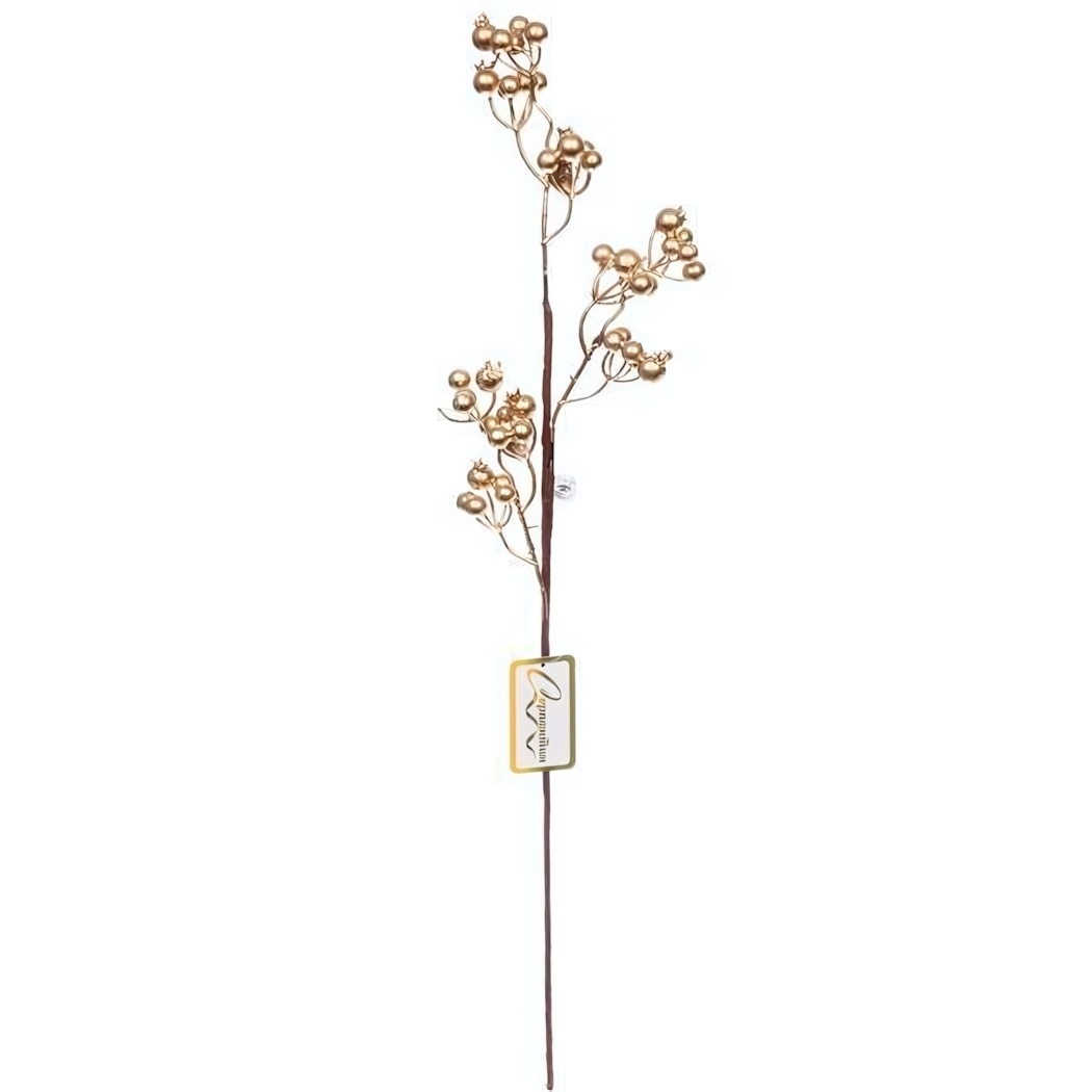 Эта искусственная ветка длиной 60 см отлично подходит для создания праздничной атмосферы, интерьерных композиций или украшения мероприятий. Украшена тонкими веточками с декоративными ягодами в золотистом цвете, что добавляет изящества и торжественности любому пространству.