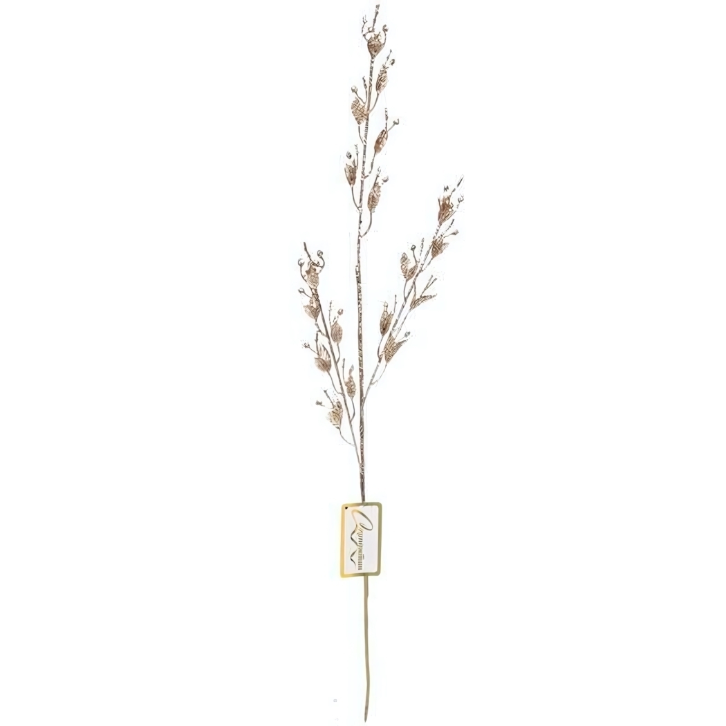 Ветка выполнена из качественного искусственного материала, устойчивого к деформации. Цвет — шампань с золотистыми акцентами, создающими мерцающий эффект при освещении. Подходит как для домашнего использования, так и для оформления витрин магазинов, офисов или праздничных мероприятий.