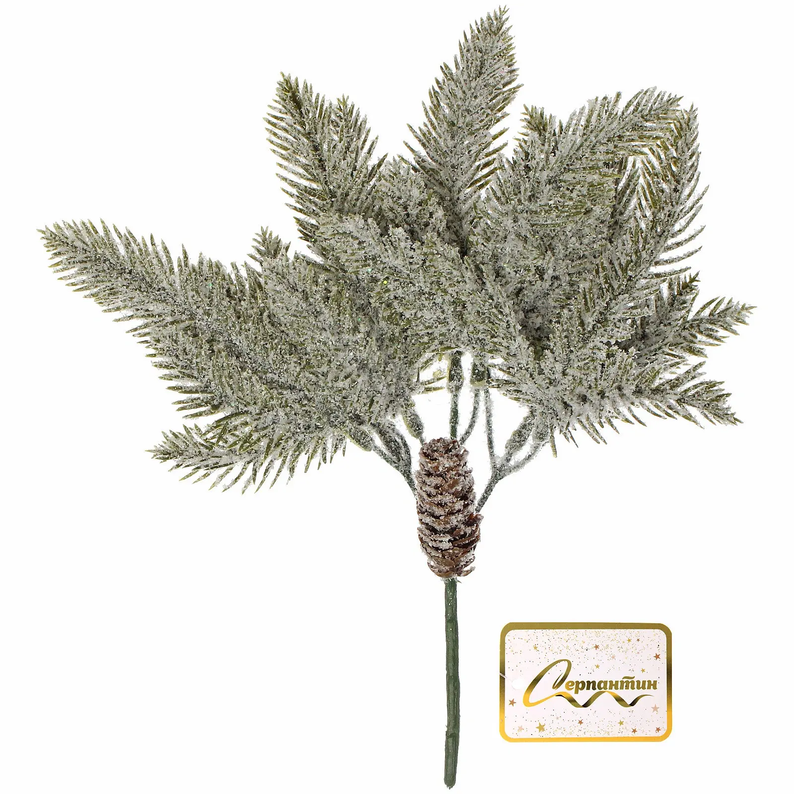 Длина ветки — 30 см, материал — качественный пластик, имитирующий натуральную хвою. Цвет — зелёный с белым налётом искусственного снега, шишка коричневая с белёсым покрытием. Отгружается один товар.