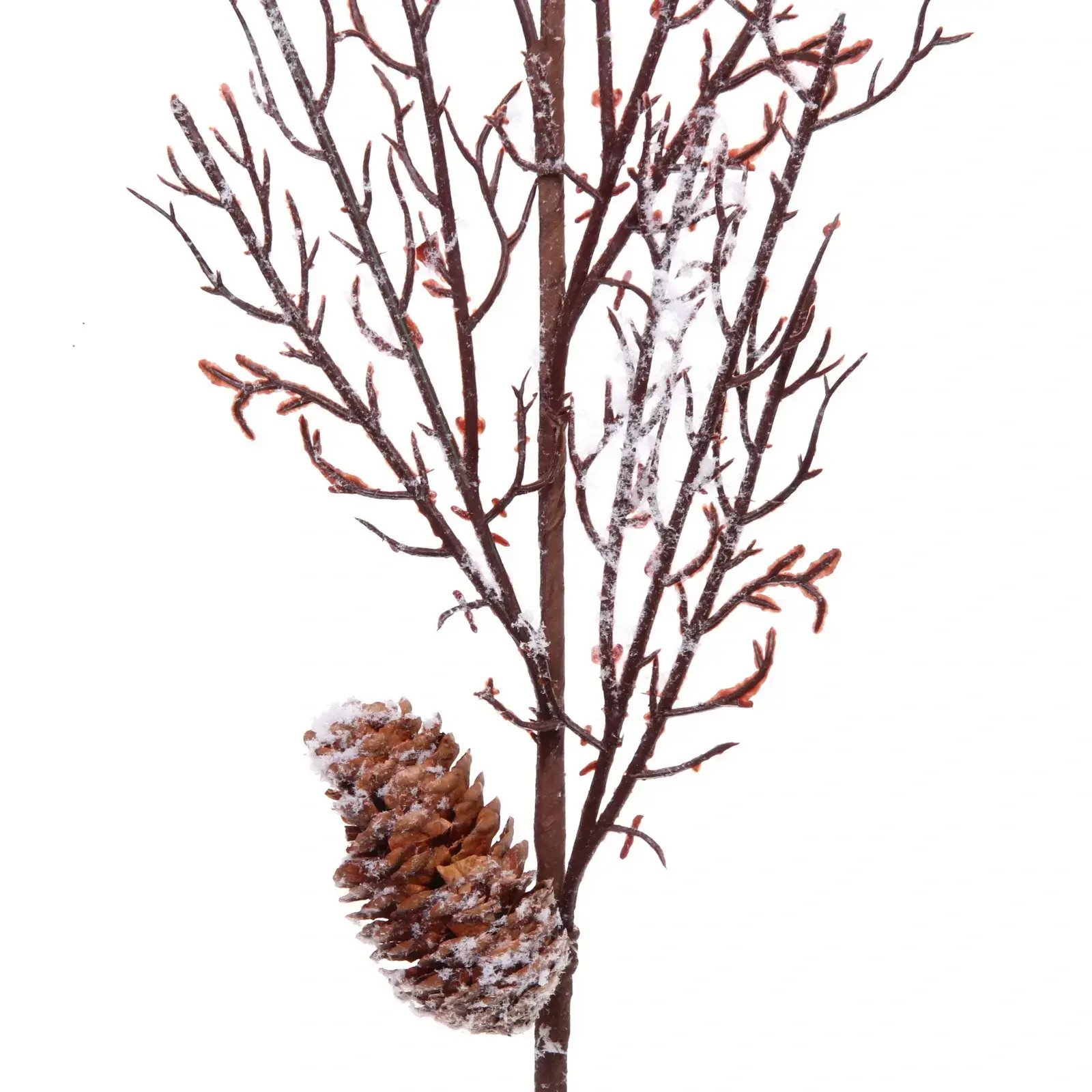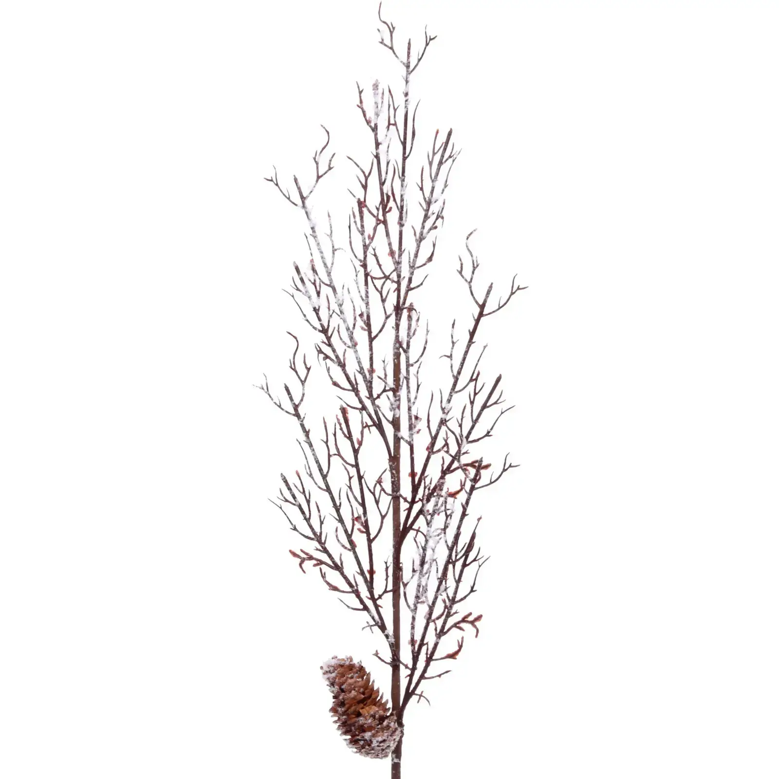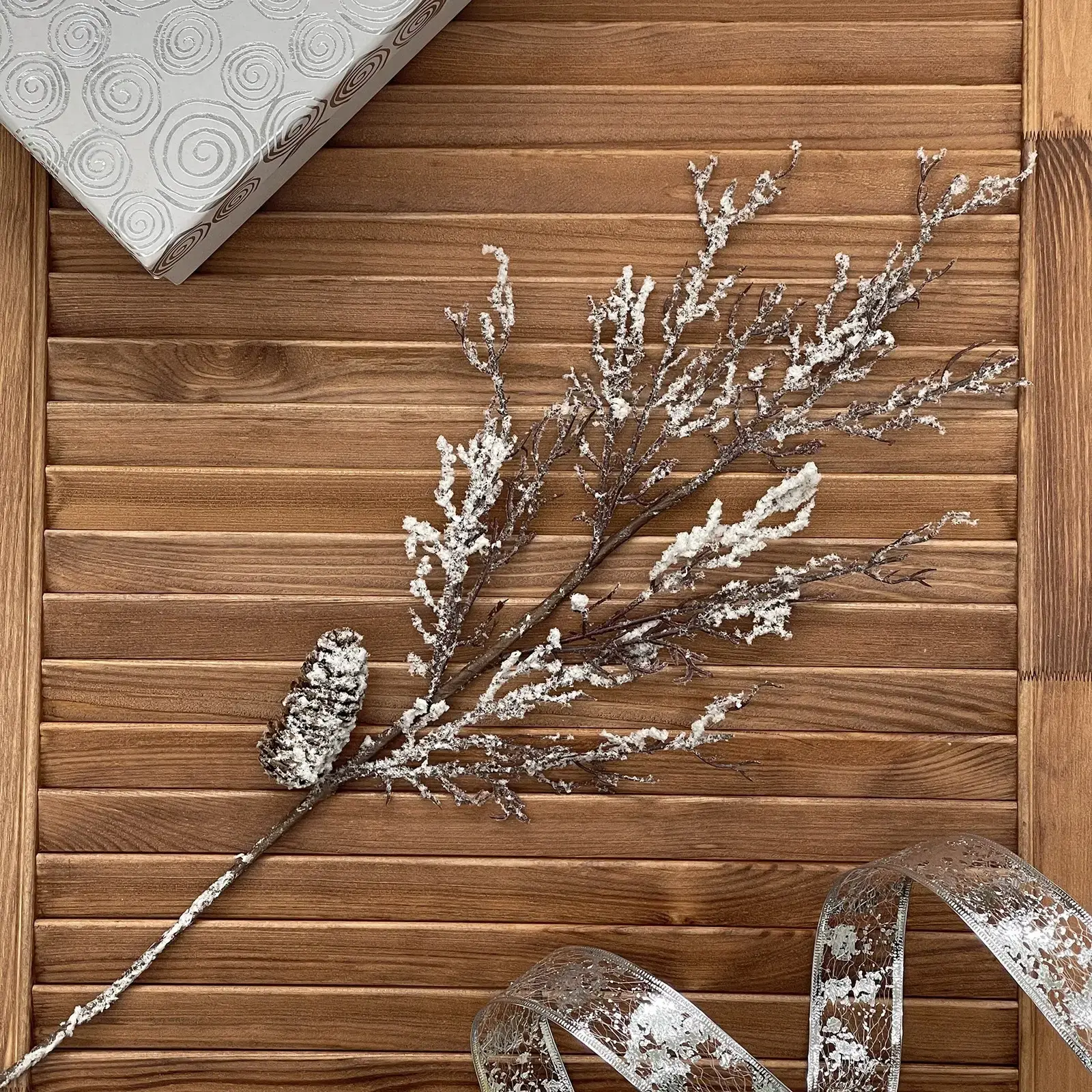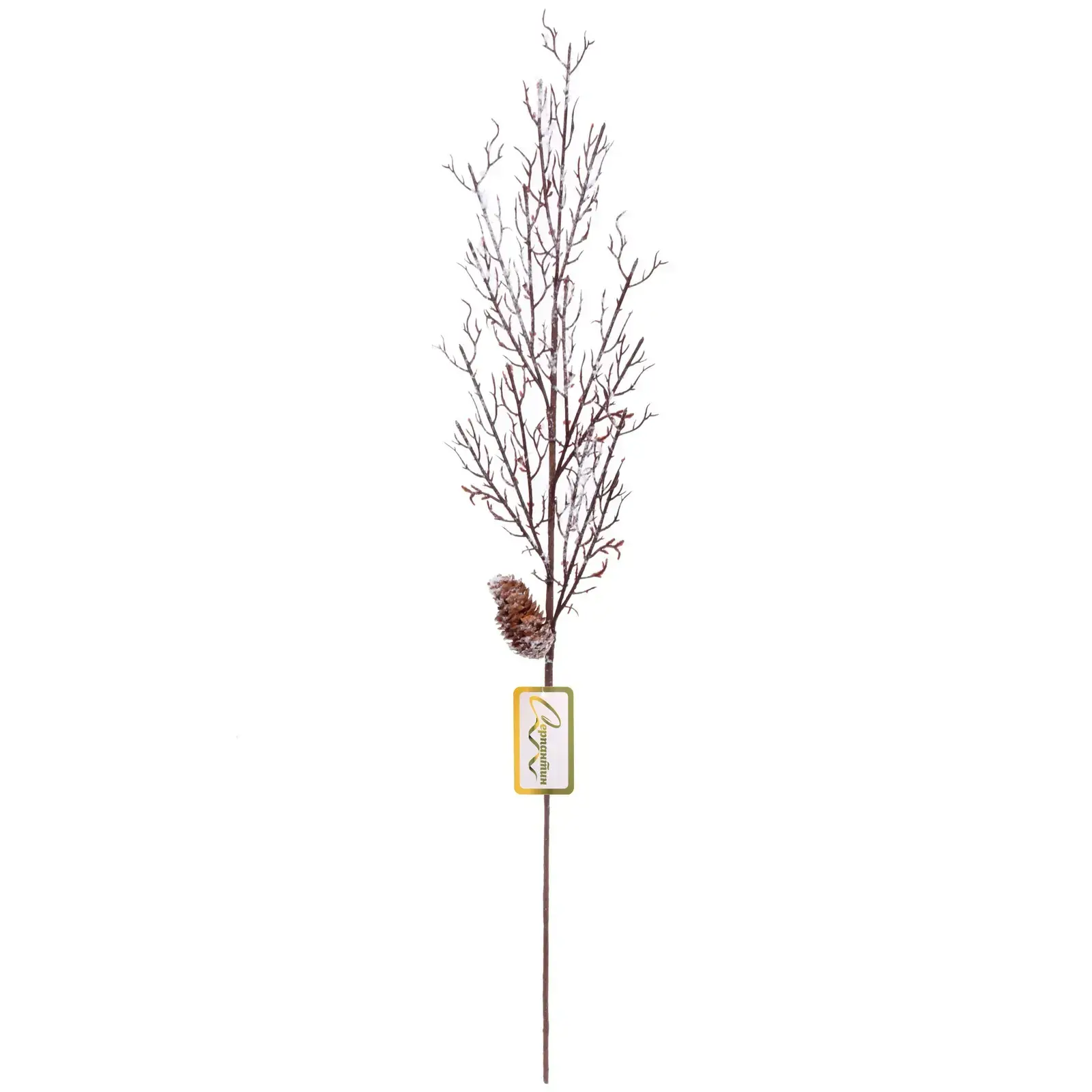 Ветка выполнена из качественного пластика, что обеспечивает её долговечность и устойчивость к внешним воздействиям. Коричневый цвет с белыми вкраплениями, имитирующими снег, придаёт ей естественный и привлекательный вид. Шишка, расположенная в нижней части ветки, добавляет дополнительный элемент, который делает её ещё более реалистичной.