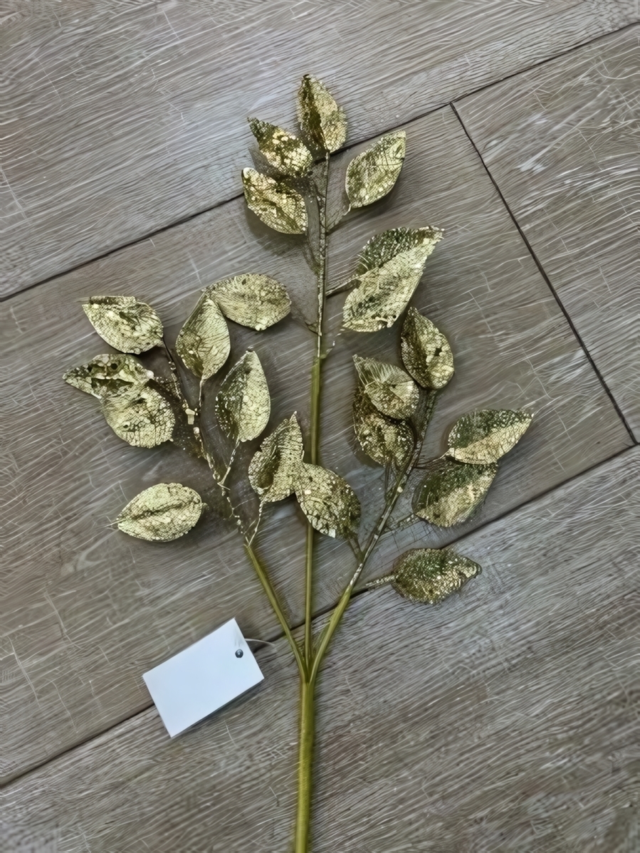 Длина ветки составляет 50 см. Стебли выполнены в золотисто‑жёлтом цвете, а листья – овальной формы с заострёнными концами, покрыты блеском, имитирующим золотистые блёстки. Внутри закреплён прочный металлический стержень, обеспечивающий устойчивость конструкции.
