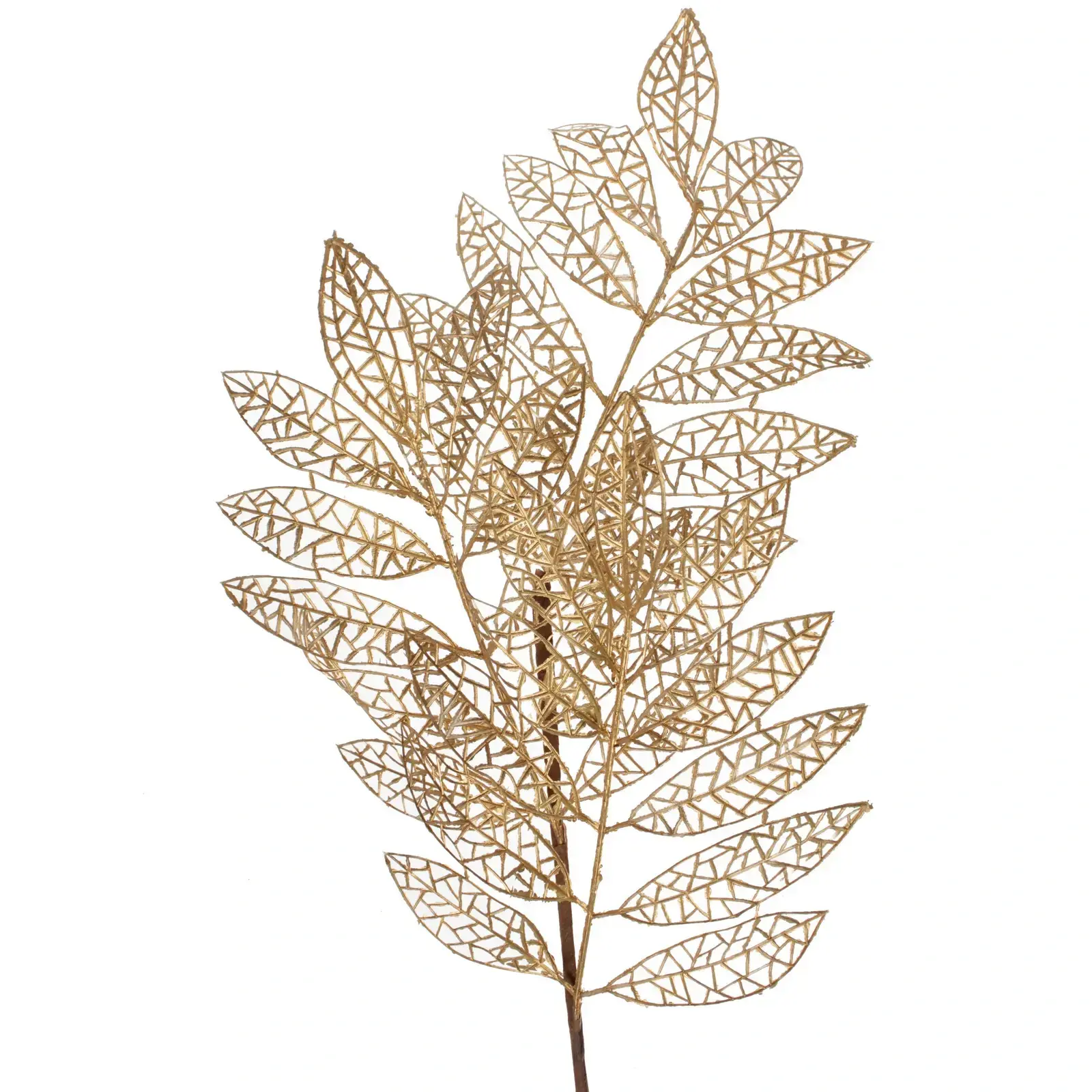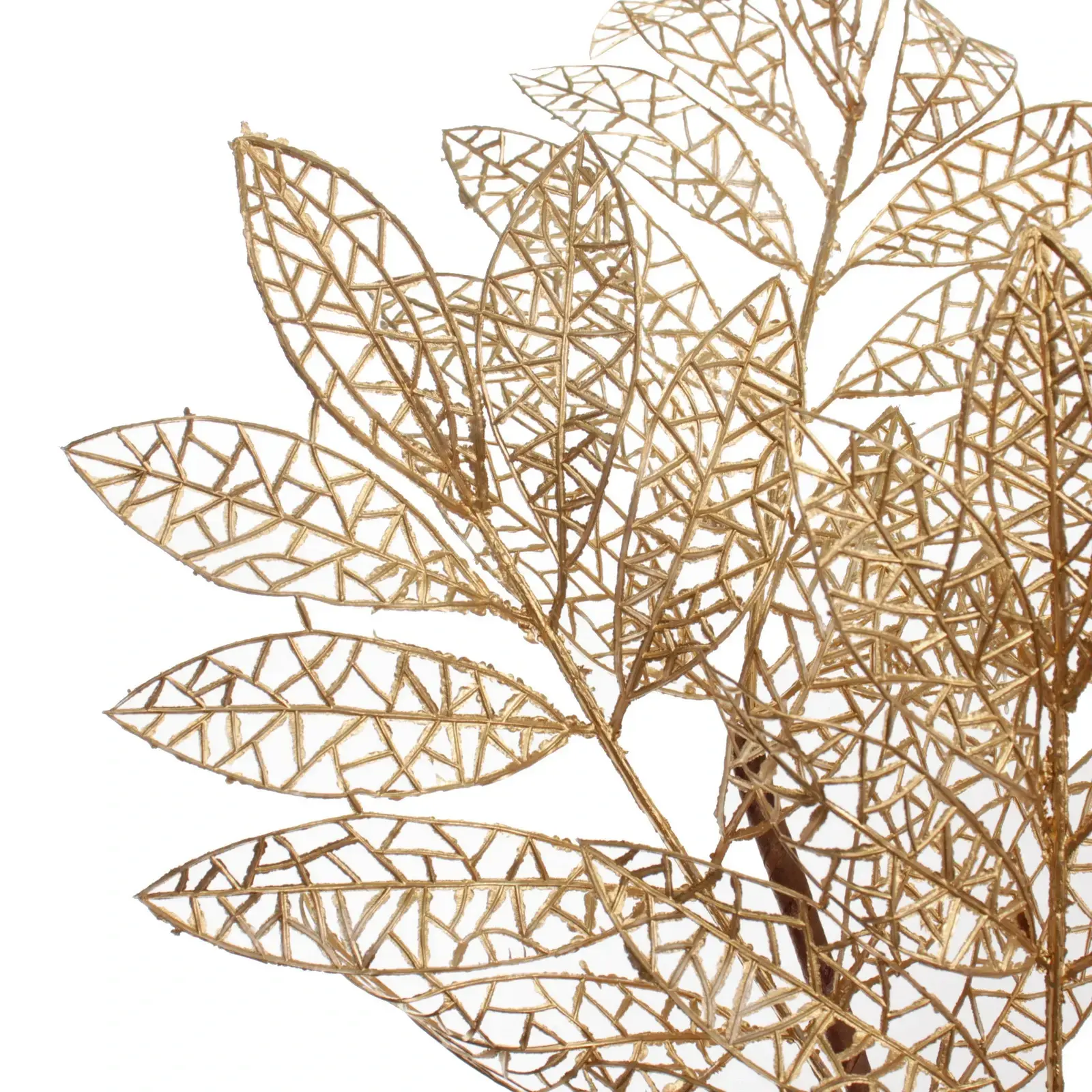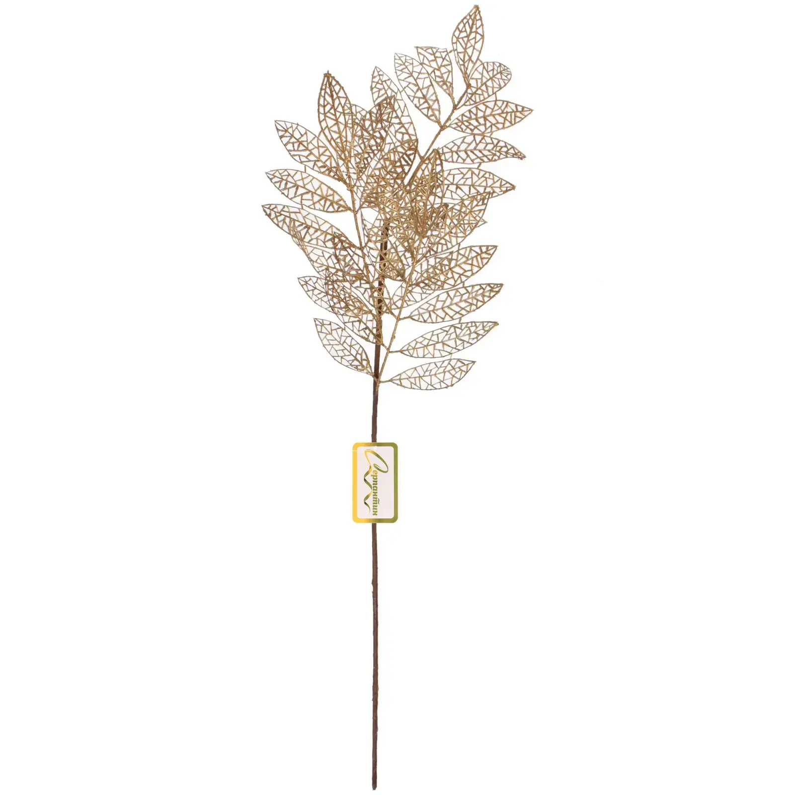 Преимущества этого товара заключаются в его долговечности и практичности. Изготовленная из качественного пластика, ветка устойчива к повреждениям и легко очищается от пыли. Золотистый цвет и ажурная структура листьев создают эффект легкости и воздушности, что делает ее идеальным выбором для любого сезона, особенно для новогодних праздников.