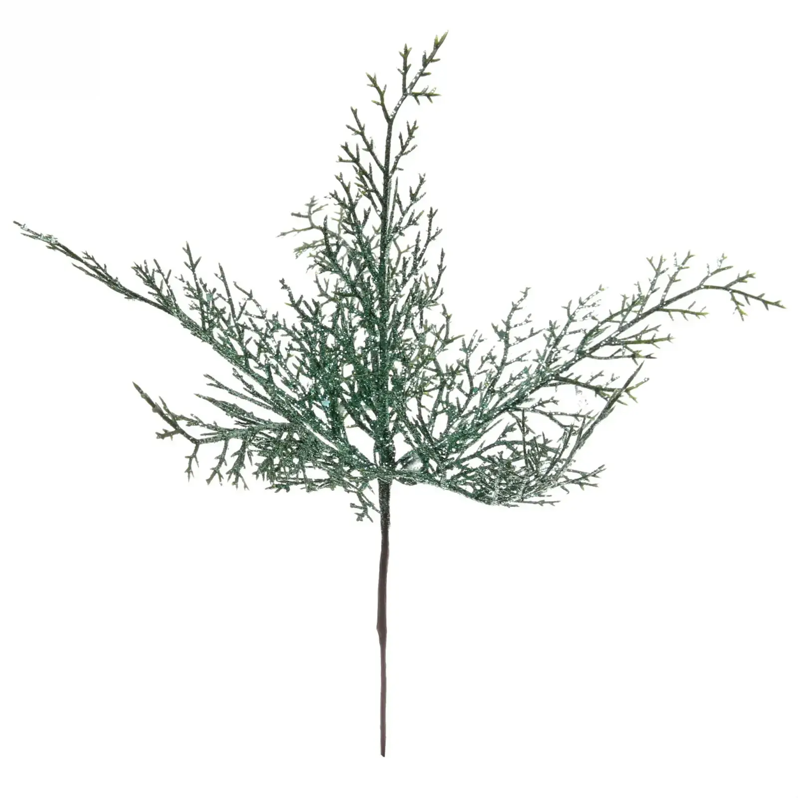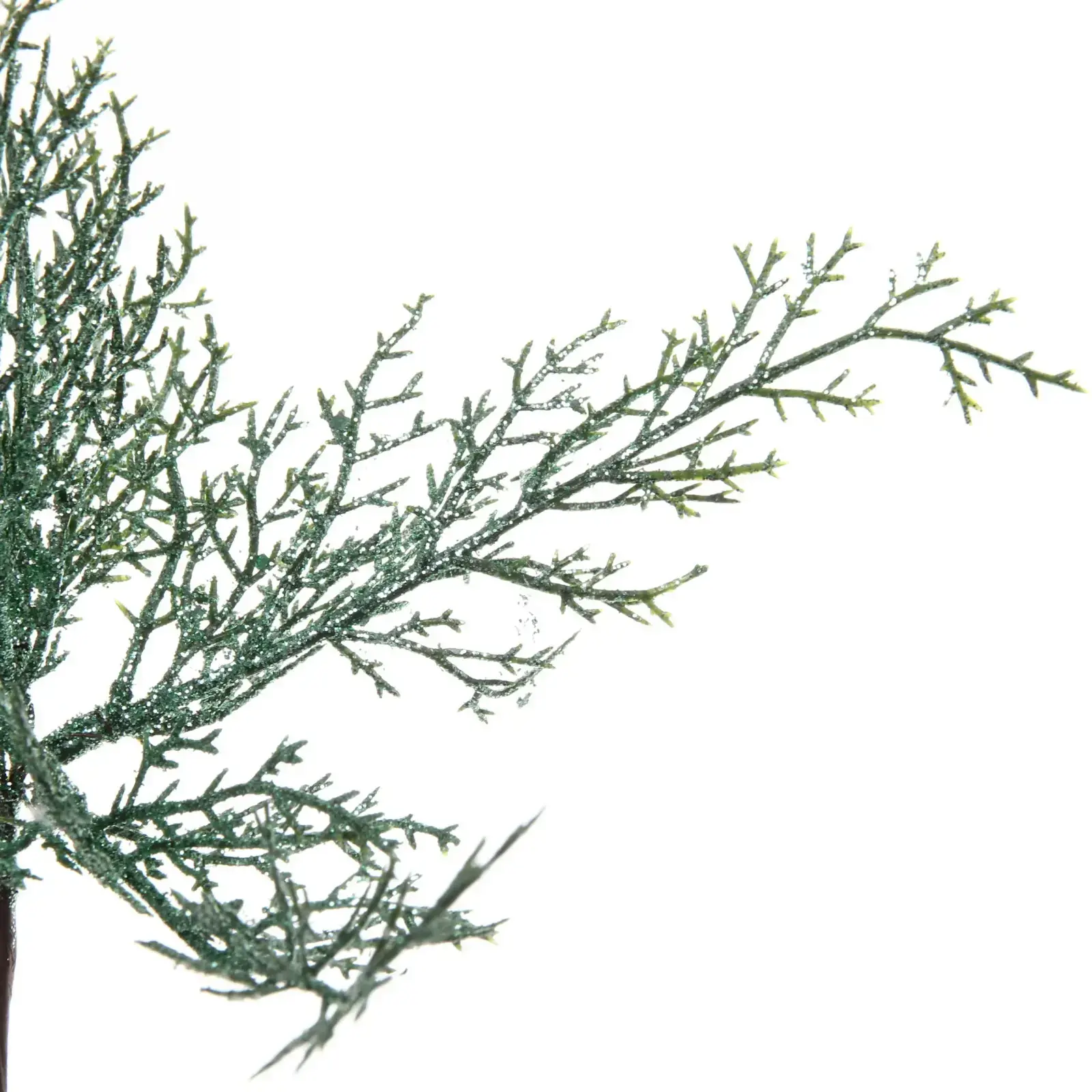 Ветка длиной 27 см изготовлена из прочного пластика с матовой поверхностью. Нежный зеленый цвет с градиентными переходами имитирует натуральную хвою. Тонкие ответвления (до 0.5 мм толщиной) и 15 уровней ветвления создают объемную структуру. Основание стебля утолщено для устойчивости в композициях.