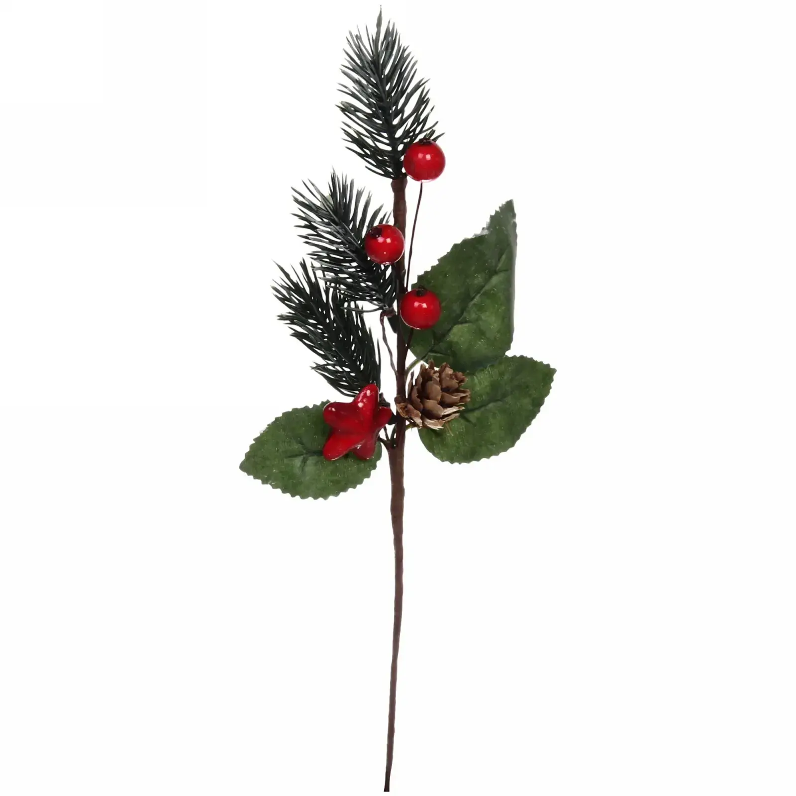Ветка имеет длину 20 см и состоит из нескольких веточек с иголками, имитирующими хвою, а также украшена тремя ярко-красными ягодами и цветком в форме звезды. Такой декор станет отличным акцентом в любом интерьере, добавляя ему яркости и оригинальности.