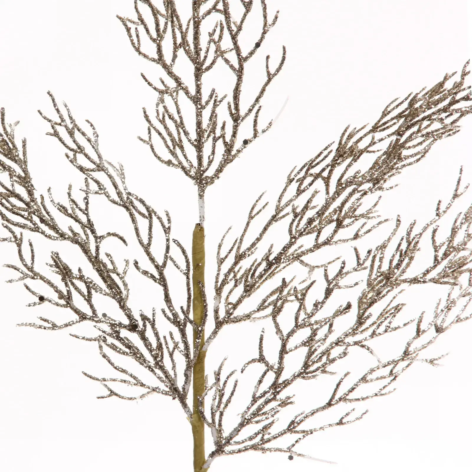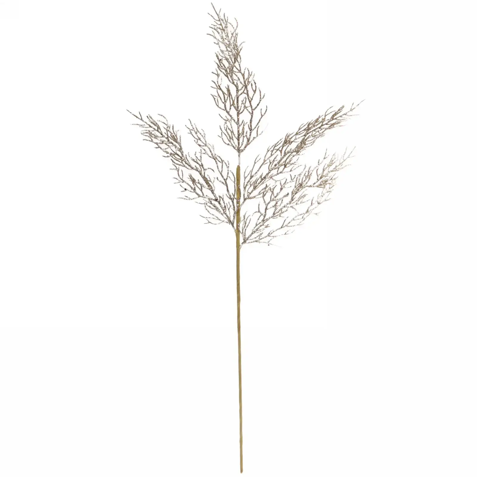 Ветка длиной 75 см с тонкими асимметричными ответвлениями покрыта блестящим напылением цвета «Шампань». Реалистичная текстура создает эффект натурального растения с металлическим акцентом.