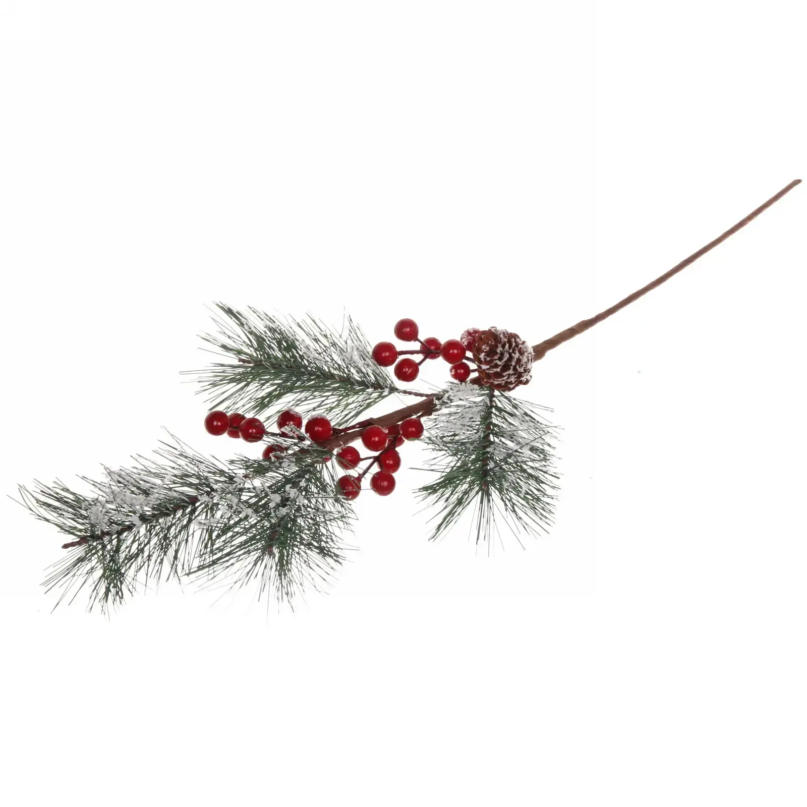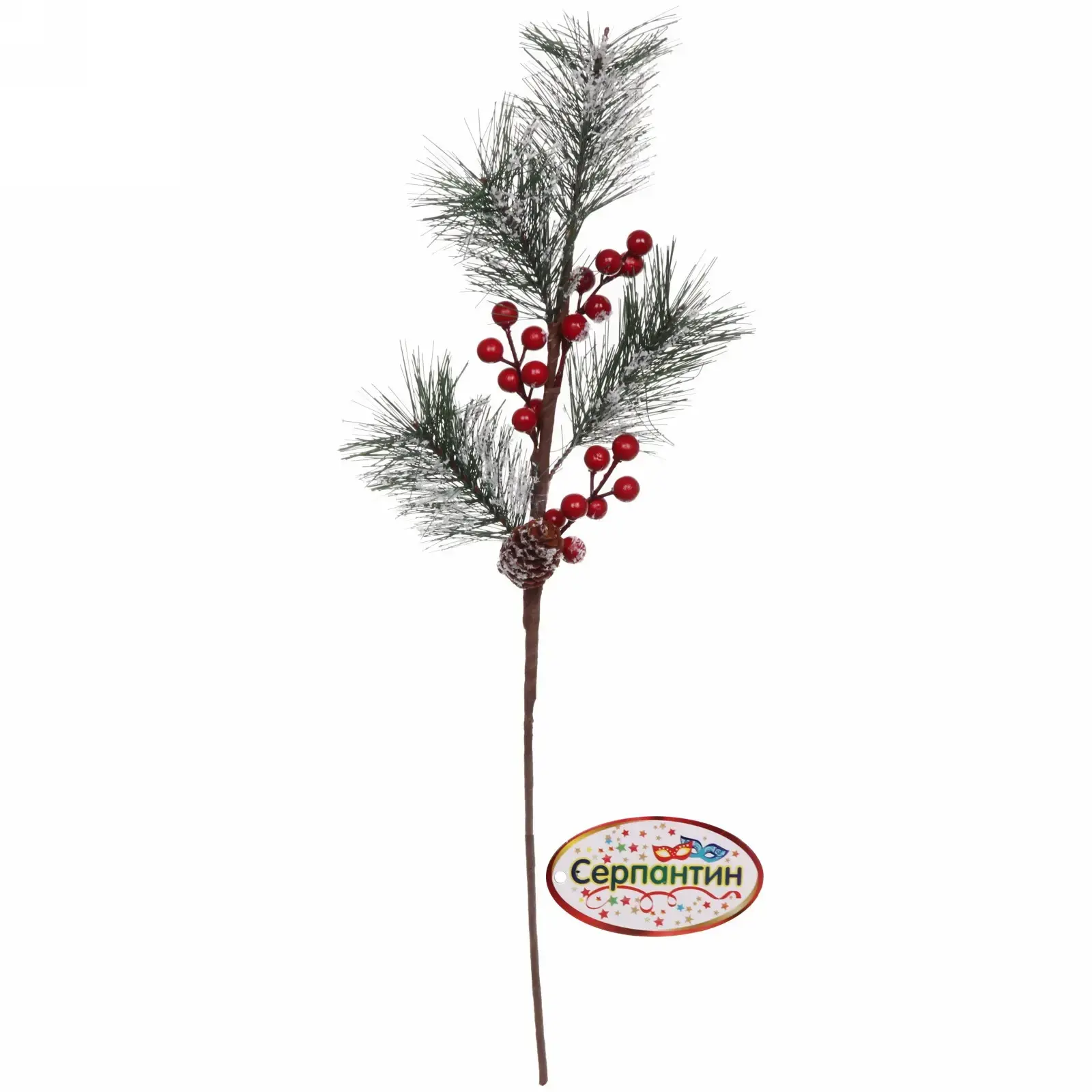 Ветка декоративная "Иней" 60см, PVC/пластик, красные ягоды и шишка