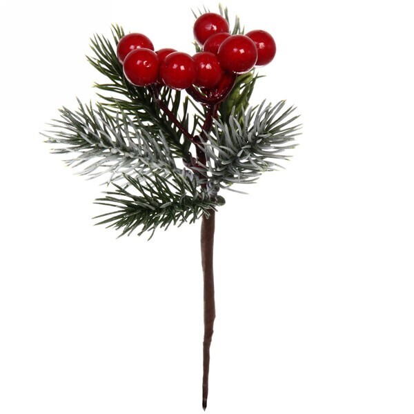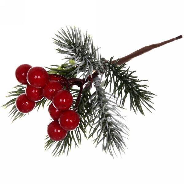 Размер ветки составляет 15 см, что делает её универсальной для использования в различных декорациях. Цвет ягод ярко-красный, а иглы выполнены в зелёном и сером цветах, что придаёт ветке естественный вид. Стебель коричневатого цвета имитирует древесину, добавляя натуральности в общий облик.