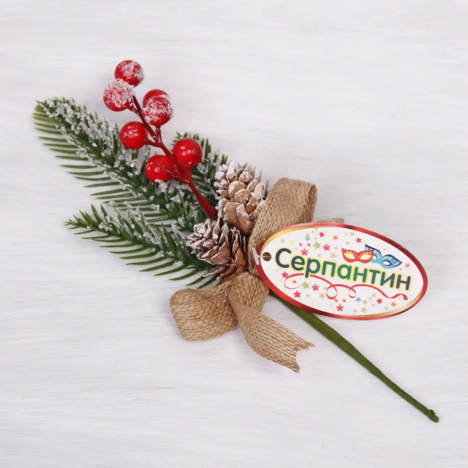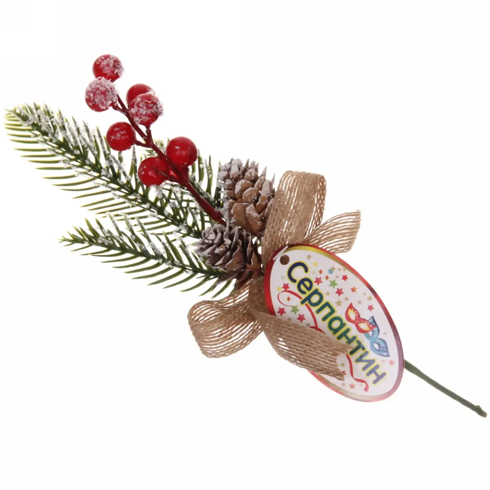 Размер ветки составляет 25 см, что делает её удобной для размещения в различных композициях. Зелёные иголки, красные ягоды и коричневая шишка с белым налетом создают гармоничное сочетание, а бежевый бантик добавляет изысканности. Эта ветка станет отличным дополнением к вашему праздничному декору и поможет создать незабываемую атмосферу уюта и тепла.