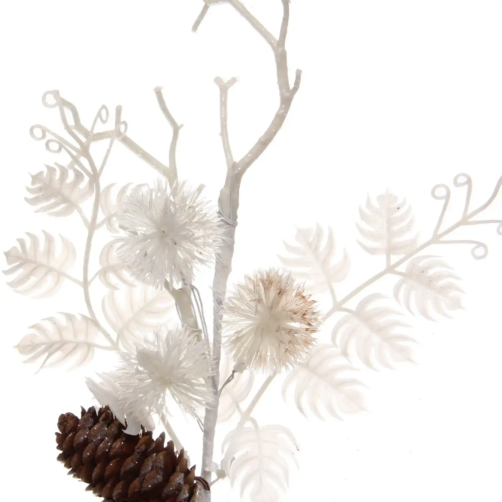 Эта декоративная ветка станет идеальным элементом для оформления вашего интерьера в зимний период. Она выполнена в белом цвете, что придаёт ей свежесть и легкость, а натуральная коричневая шишка добавляет уют и тепло. Используйте ветку для создания новогодних композиций, украшения праздничного стола или как самостоятельный элемент декора.