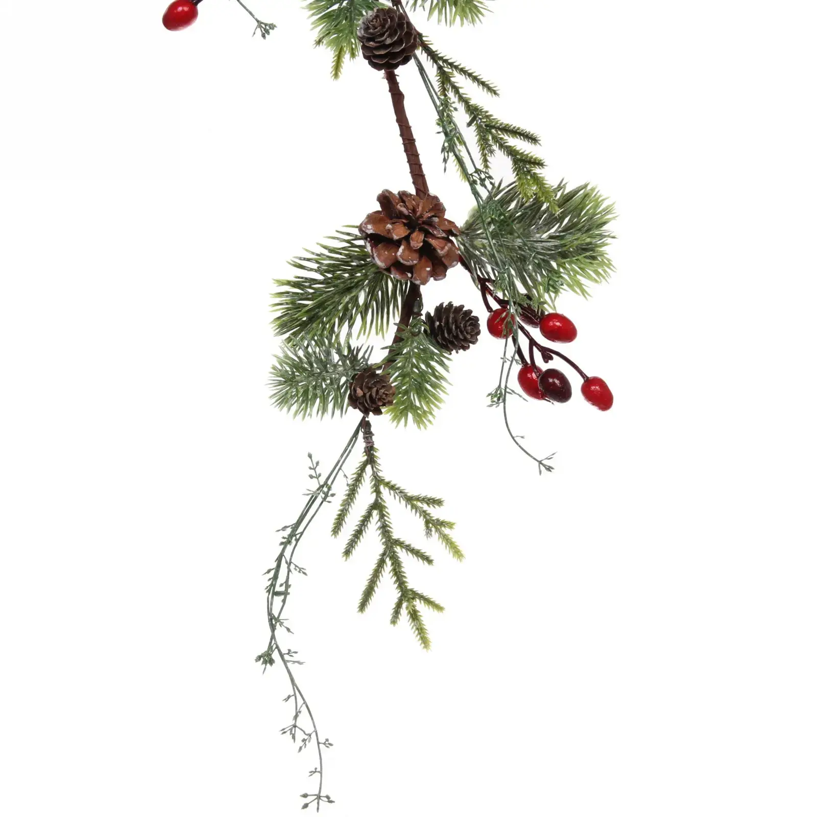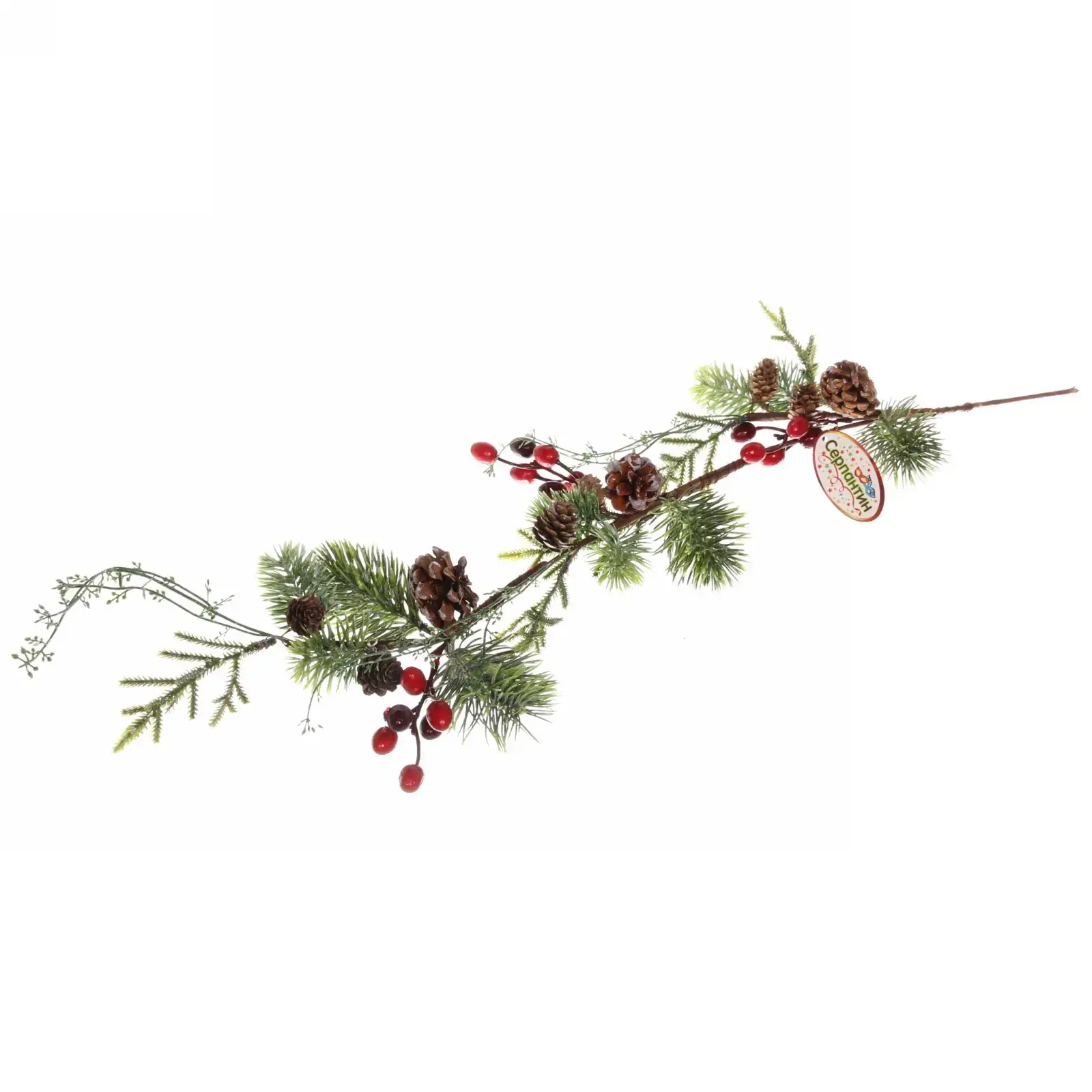 Основной цвет ветки — зеленый, что создает эффект натуральной хвои. Ягоды красного цвета и коричневые шишки добавляют яркие акценты, делая ветку привлекательной и стильной. Размеры ветки составляют 78 см в длину, что позволяет использовать её в самых различных декорациях. Не упустите возможность сделать ваш Новый год незабываемым с веткой «Ягодный Вальс»!