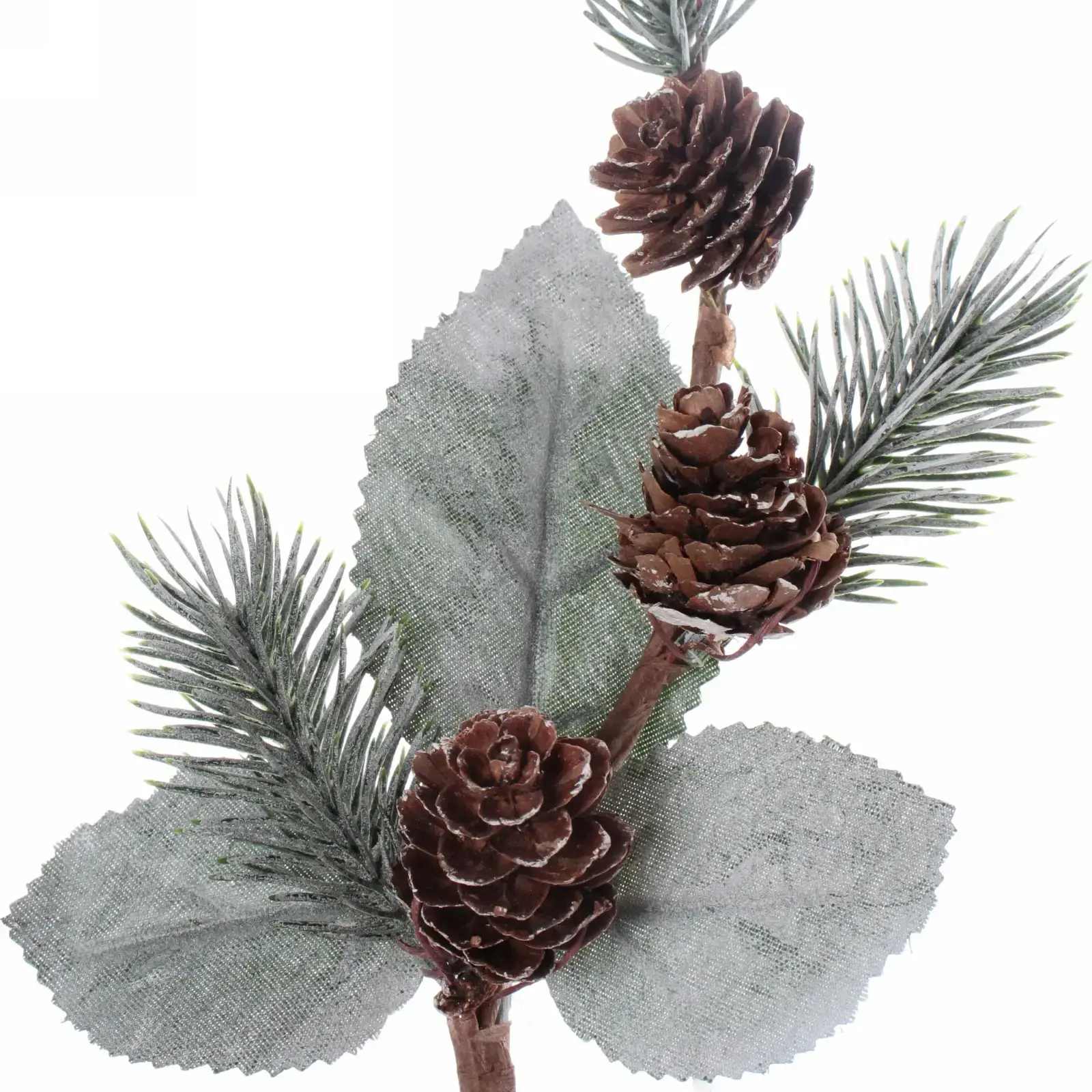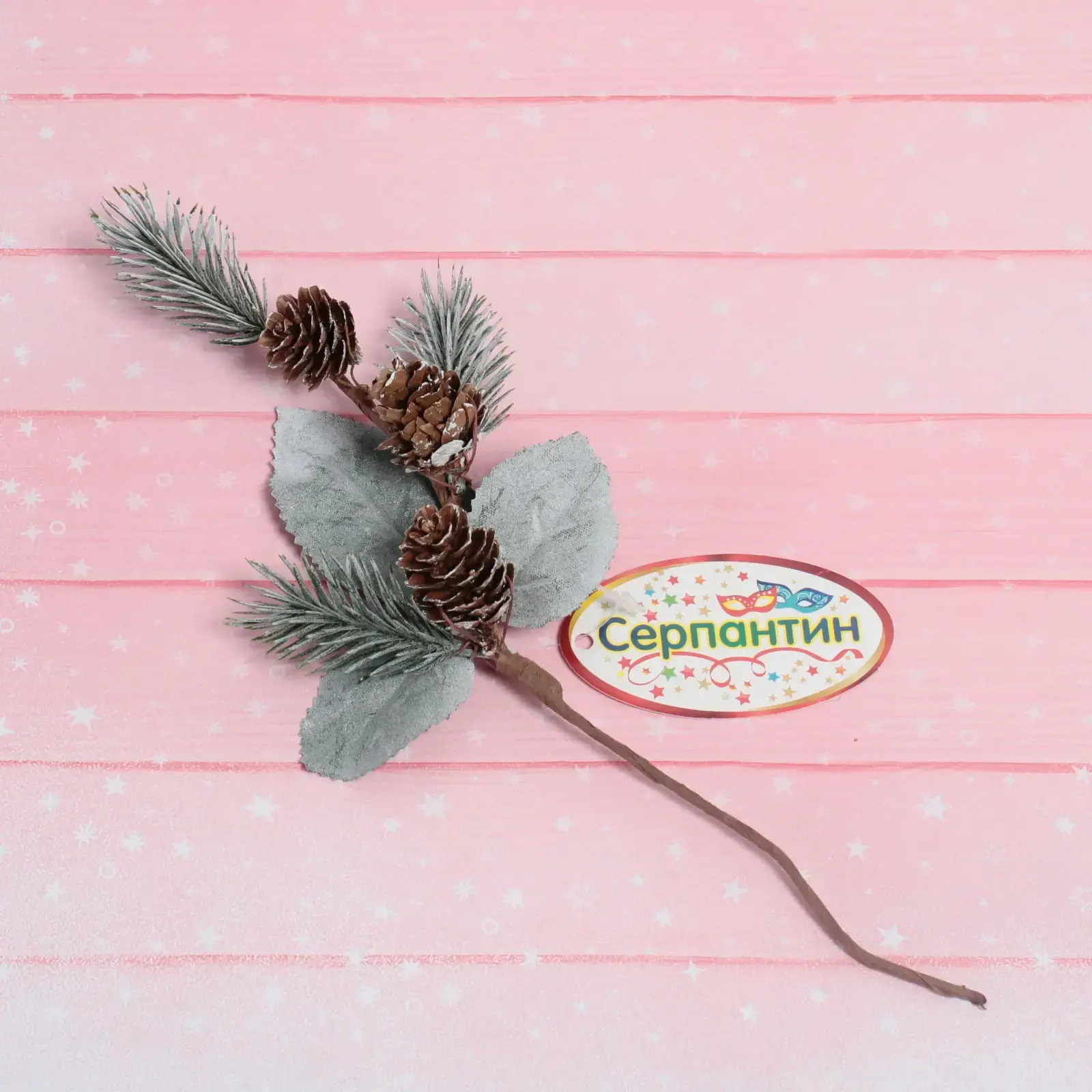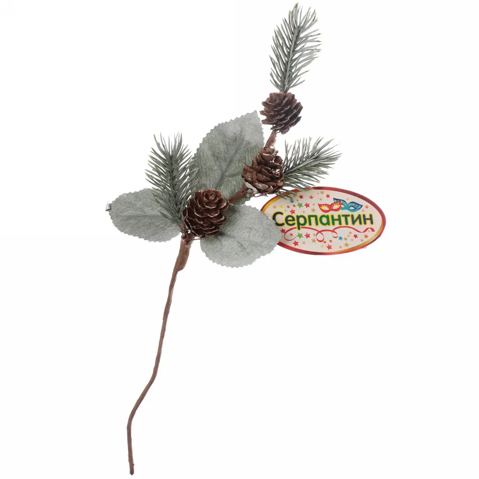 Размер ветки составляет 29 см, что делает ее универсальным элементом для различных композиций. Цветовая гамма включает коричневые шишки, зеленые иголки и серые листья, что создает гармоничное сочетание. Используйте ветку для создания уникальных новогодних украшений и наслаждайтесь атмосферой праздника в вашем доме!