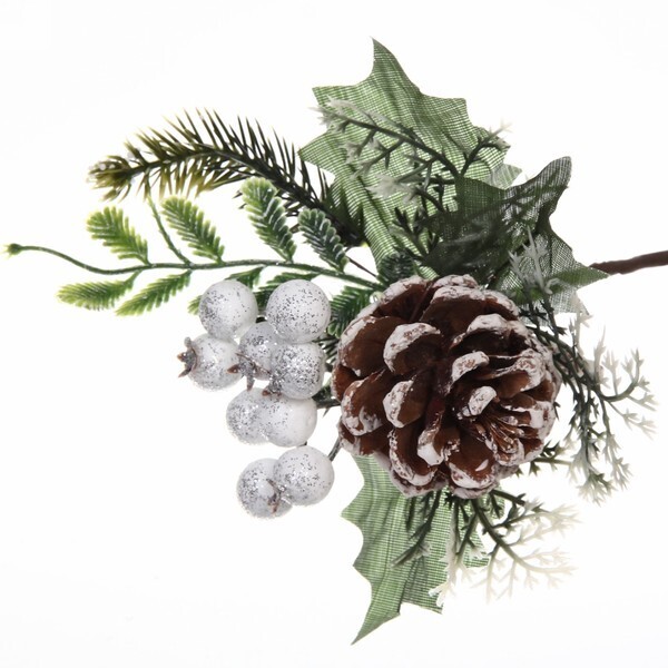 Ветка выполнена в естественных цветах, сочетая зелёные иголки, коричневые шишки и белые ягоды, что делает её универсальной для любого стиля оформления. Размер 22 см позволяет легко интегрировать её в любые композиции, не занимая много места. Используйте её для создания уникальных новогодних украшений и наслаждайтесь атмосферой праздника в вашем доме.