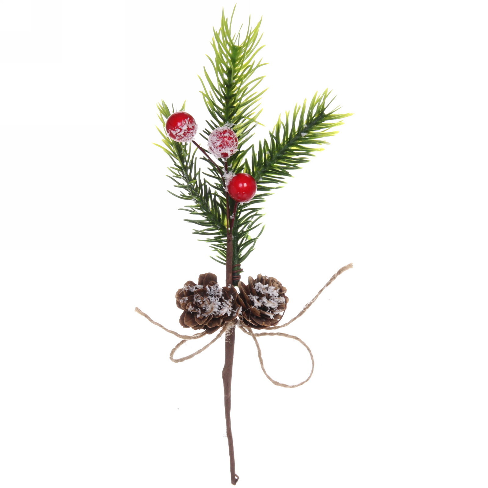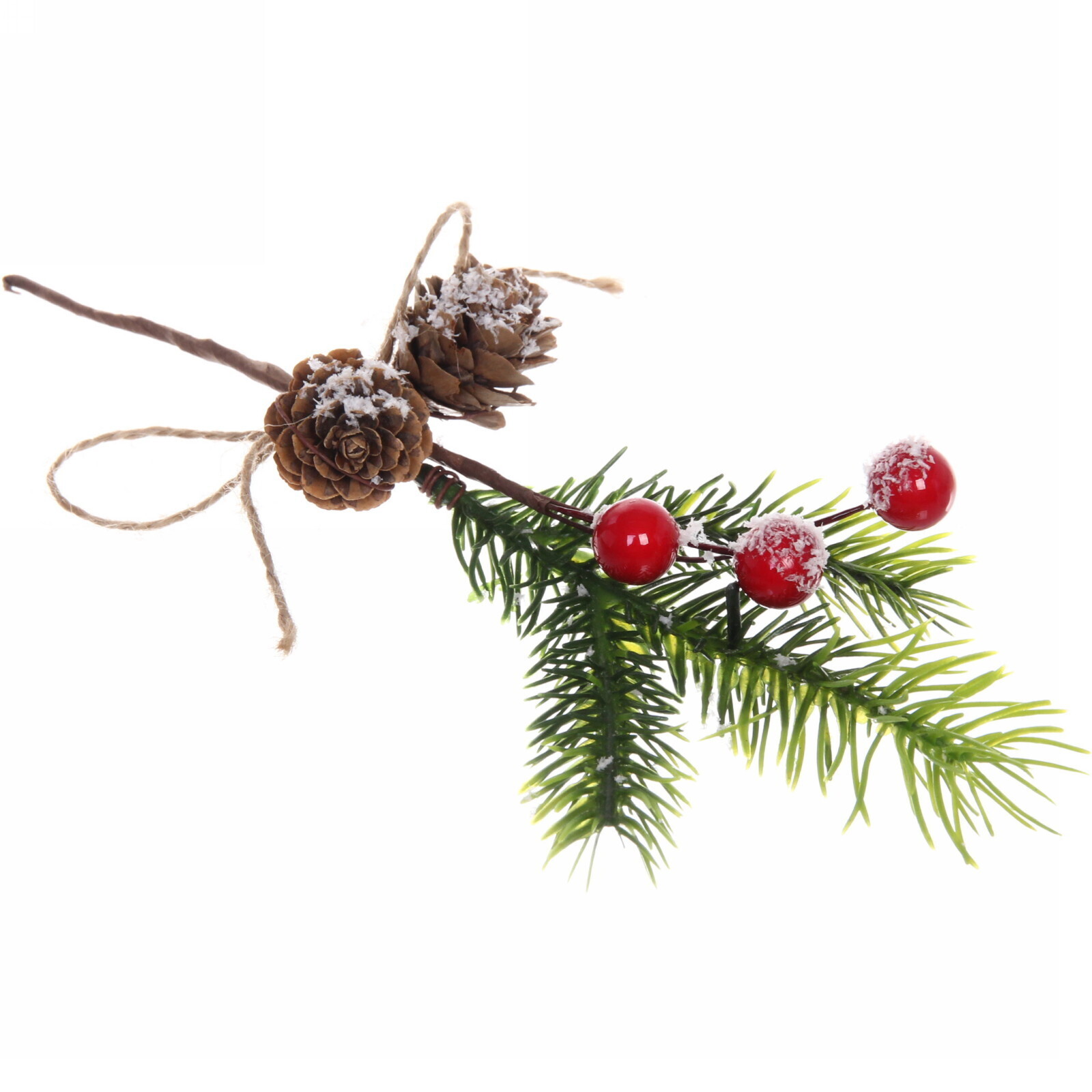 Ветка выполнена из качественных материалов, что гарантирует ее долговечность. Высота составляет 19 см, что делает ее удобной для размещения в различных местах. Яркие красные ягоды и натуральные шишки добавляют элемент стиля и делают ветку универсальной для любого интерьера.