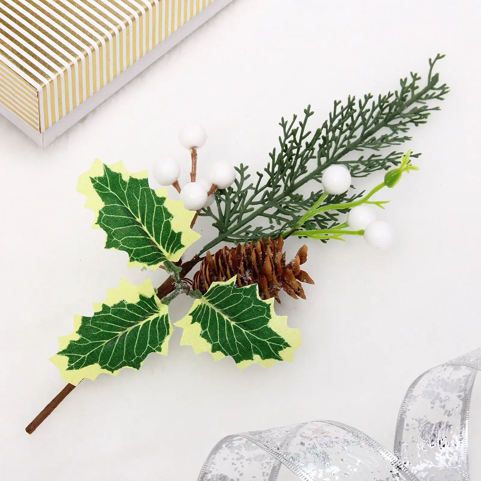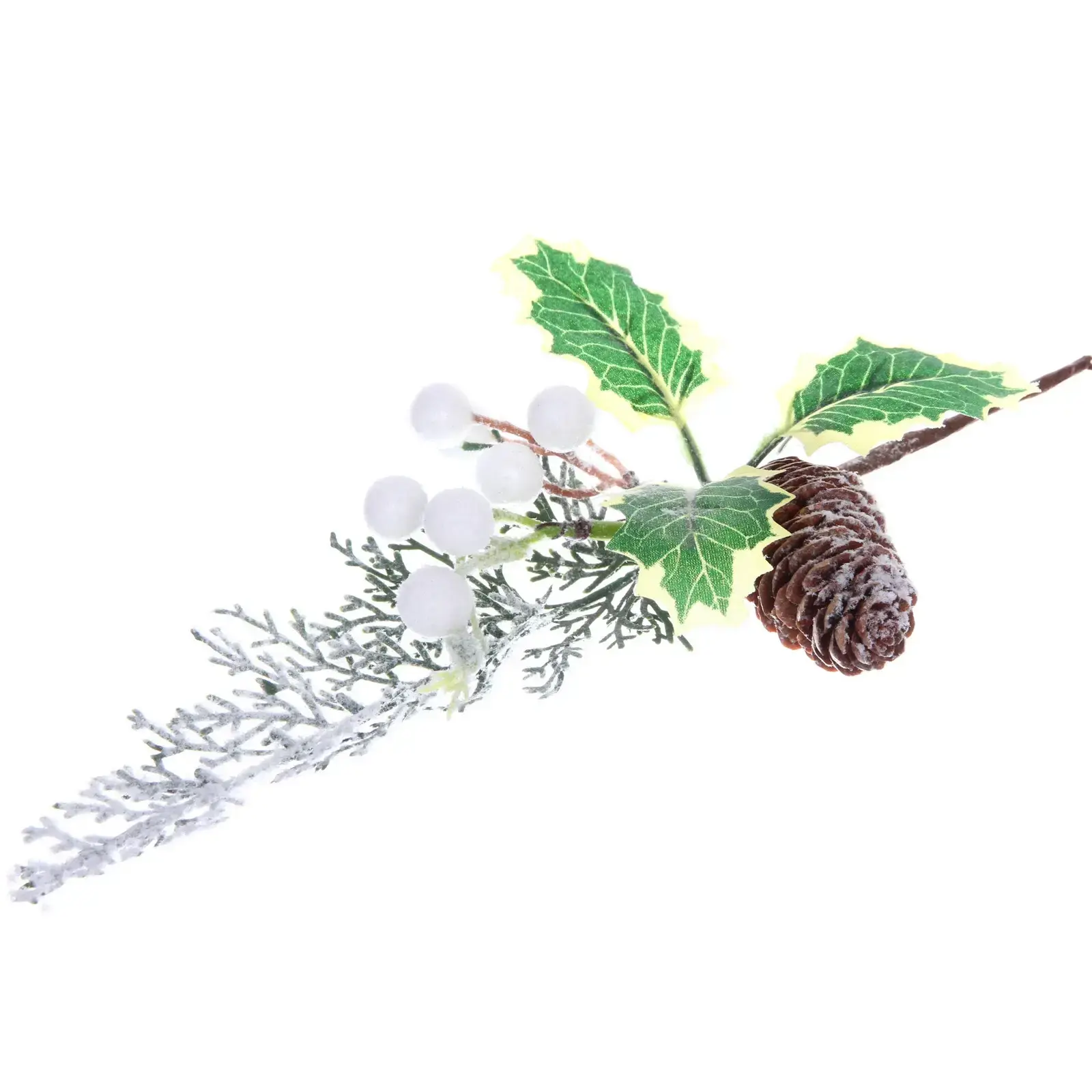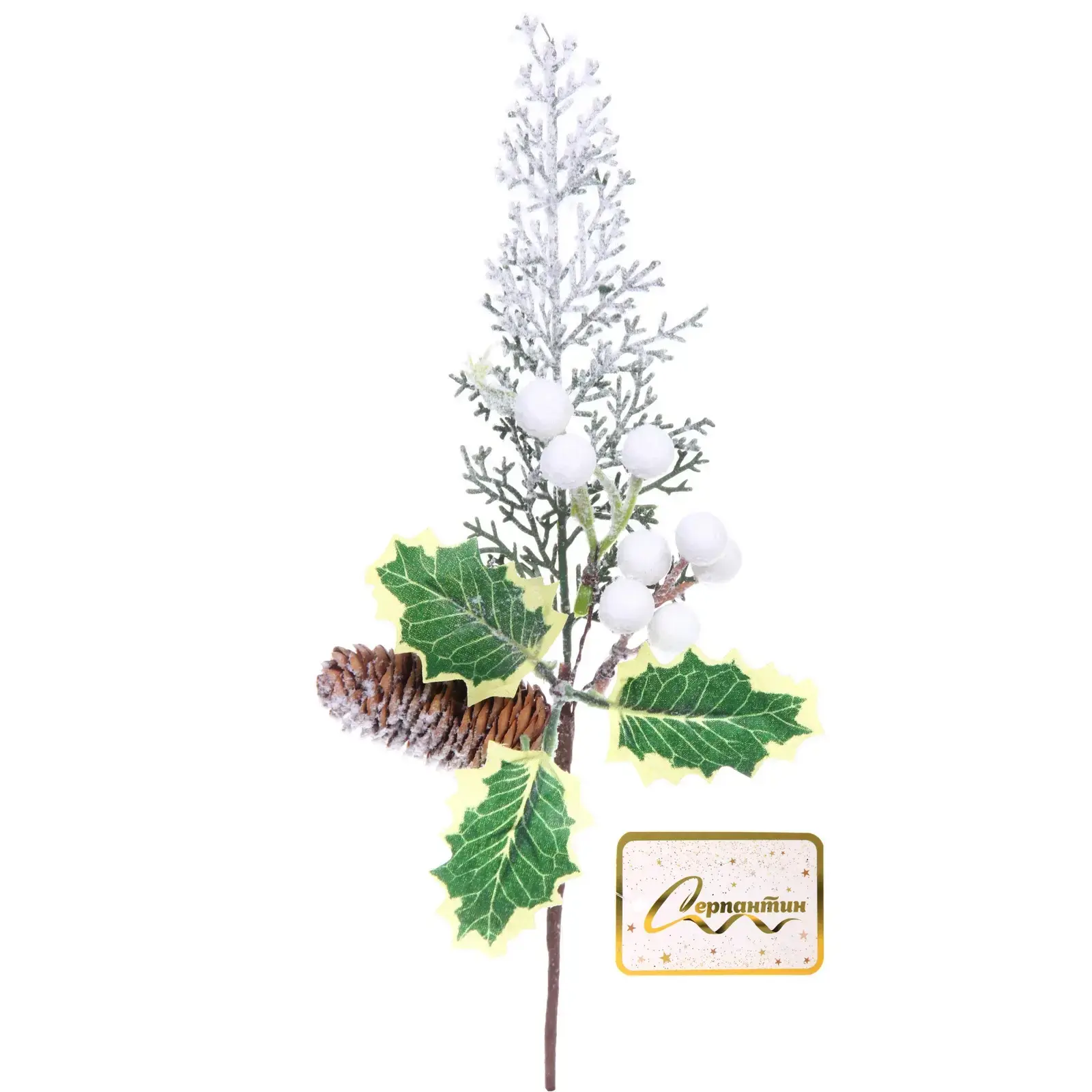 Создайте атмосферу уюта и праздника с веткой хвойной «Зимняя нежность». Эта декоративная ветка длиной 31 см станет отличным дополнением к вашему новогоднему оформлению. Яркие зеленые листья с желтыми краями, белые ягоды и коричневая шишка придают ей естественный вид, а искусственный снег создает ощущение зимней сказки.