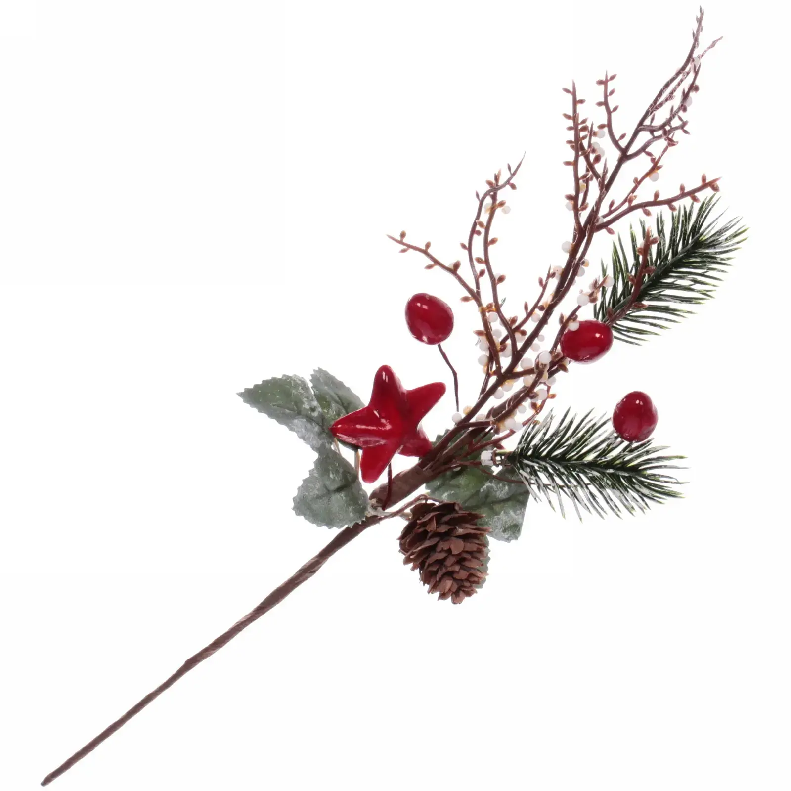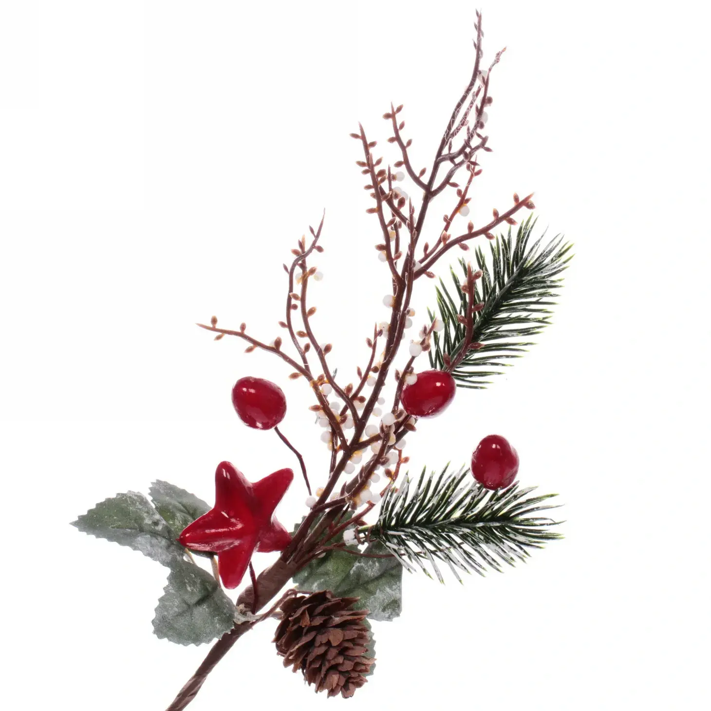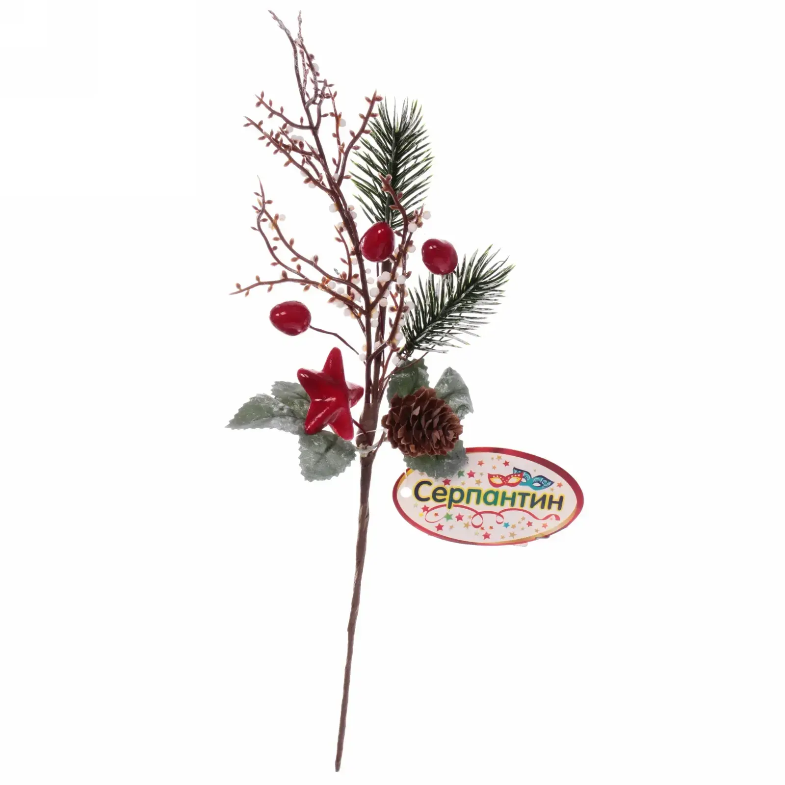 Ветка украшена красными ягодами, белыми шариками и эффектной звездой, что делает её универсальным элементом новогоднего декора.