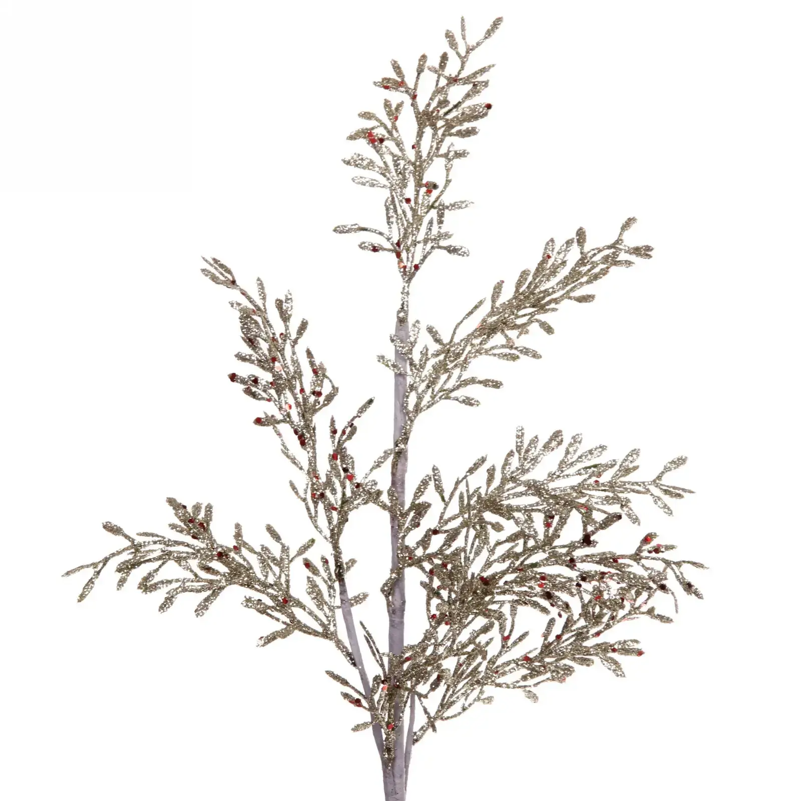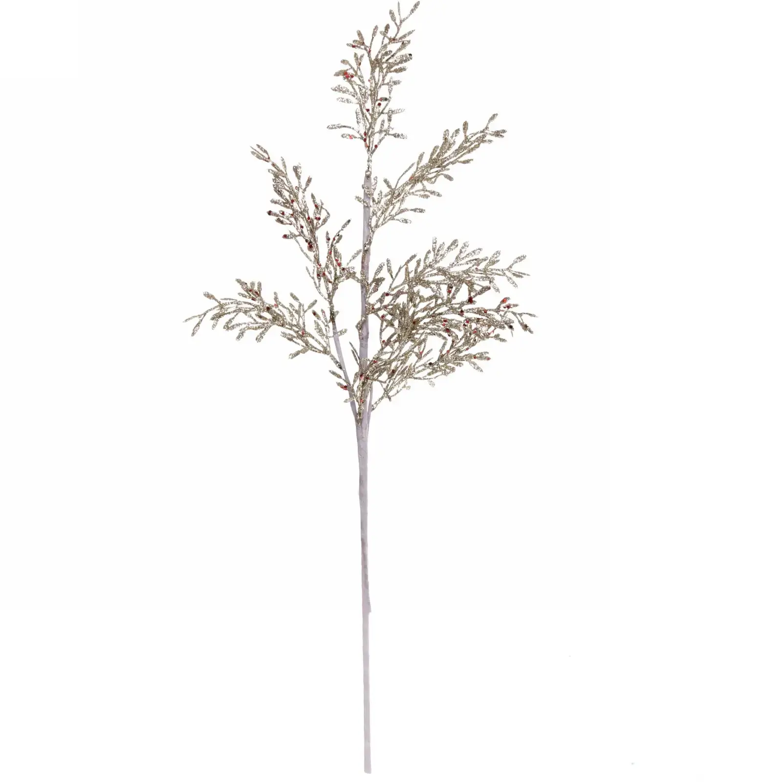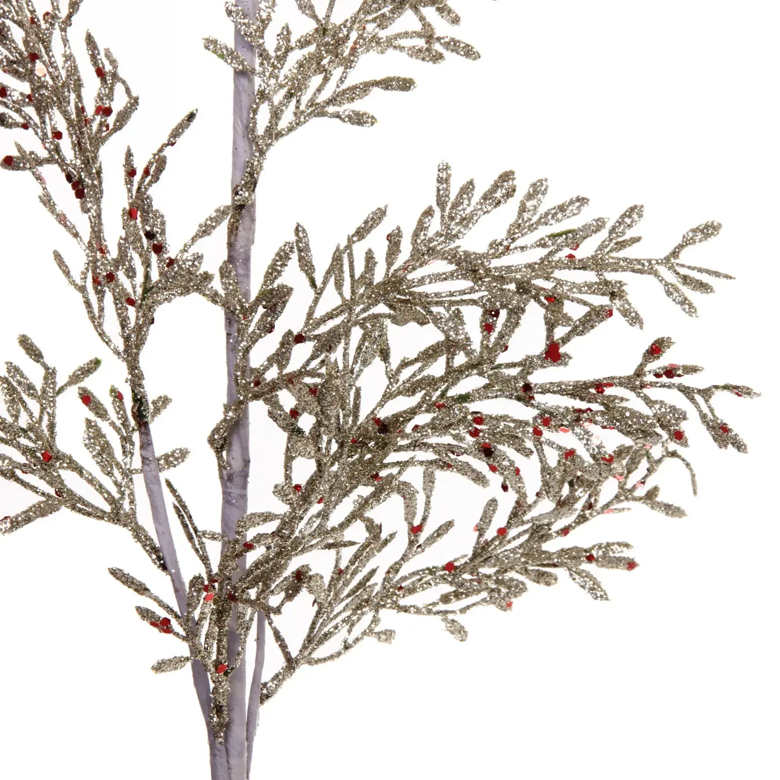Искусственная ветка с мерцающими блёстками и алыми ягодами станет идеальным акцентом в новогоднем декоре. Элегантный оттенок шампань гармонично сочетается с традиционными праздничными цветами, создавая уютную атмосферу в интерьере.