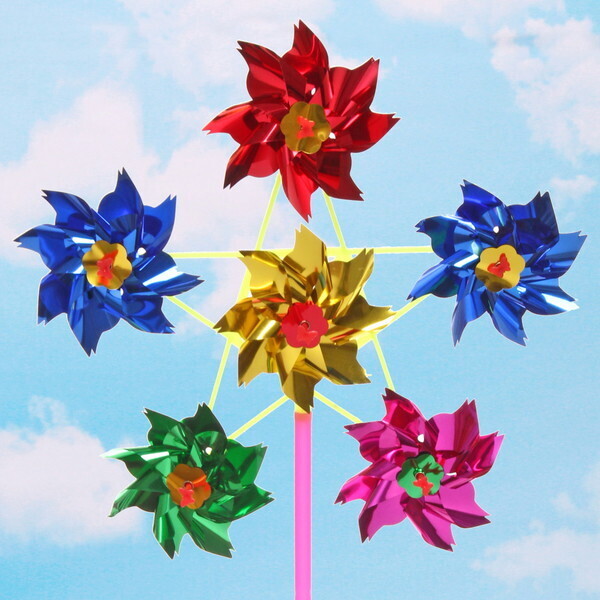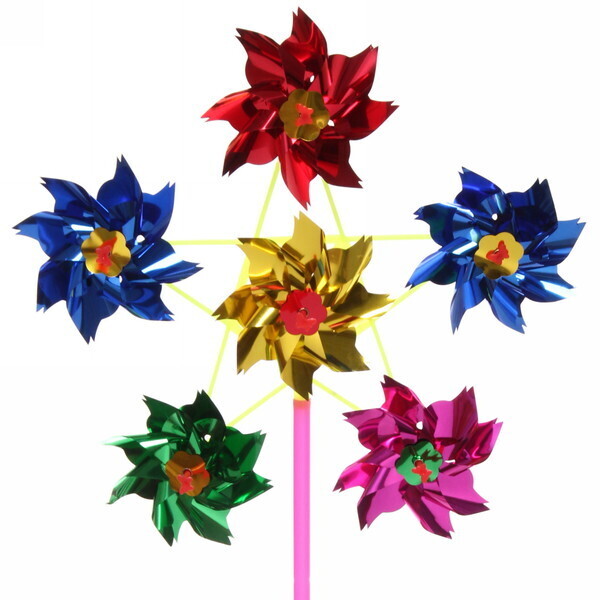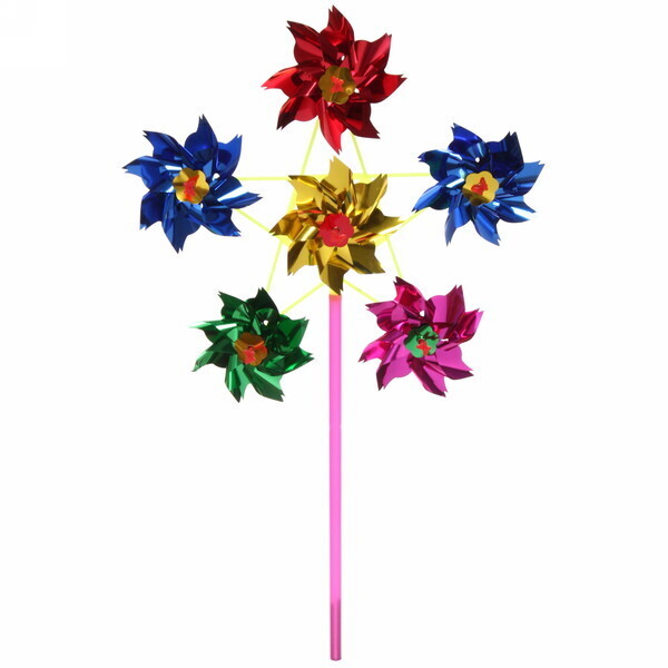 Размер ветрячка составляет 27 см в диаметре, что делает его заметным и привлекательным. Он выполнен из пластика, что обеспечивает легкость и устойчивость к внешним воздействиям. Яркие цвета — красный, синий, зеленый, желтый и розовый — создают веселую атмосферу и поднимают настроение.