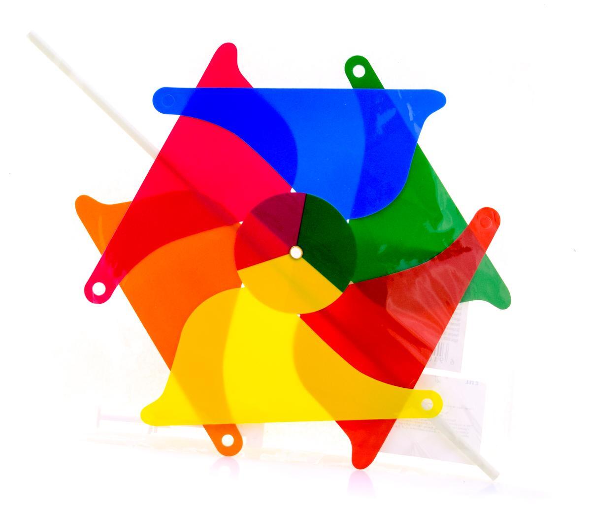 Конструкция из шести сегментов с цветовой палитрой: красный, жёлтый, зелёный, синий и оранжевый. Все элементы соединены центральной осью с подшипниковым механизмом для плавного вращения. Белая ручка длиной 25 см (ориентировочно) изготовлена из ударопрочного пластика.