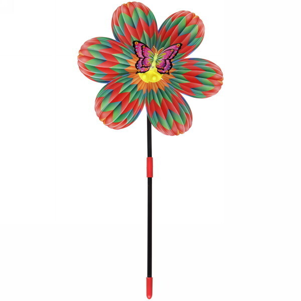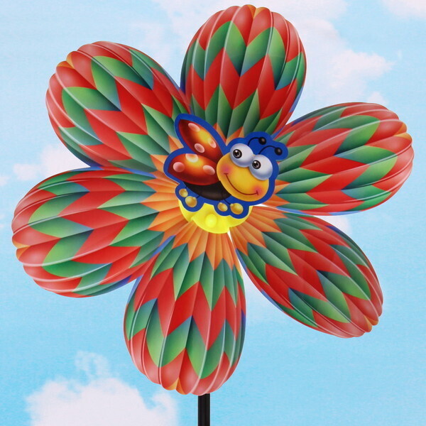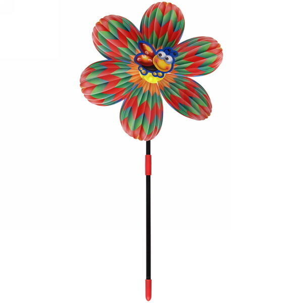 Размер ветрячка составляет 38 см в высоту и 22 см в диаметре, что делает его заметным элементом декора. Яркие лепестки выполнены в красном, зеленом и желтом цветах, а центральная часть украшена мультяшным персонажем — улыбающимся пчелёнком. Этот ветрячок станет отличным подарком для детей и взрослых, которые любят проводить время на свежем воздухе.