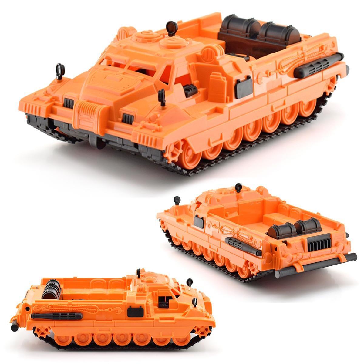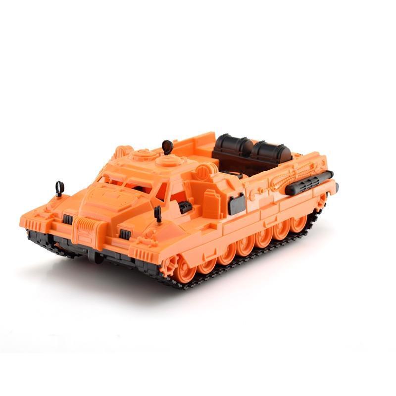 Модель размером 16х31х11 см воспроизводит особенности настоящей военной техники: рифленые гусеницы, цилиндрические топливные баки и эргономичную форму корпуса. Сочетание оранжевого и черного цветов создает яркий акцент в коллекции игрушек.