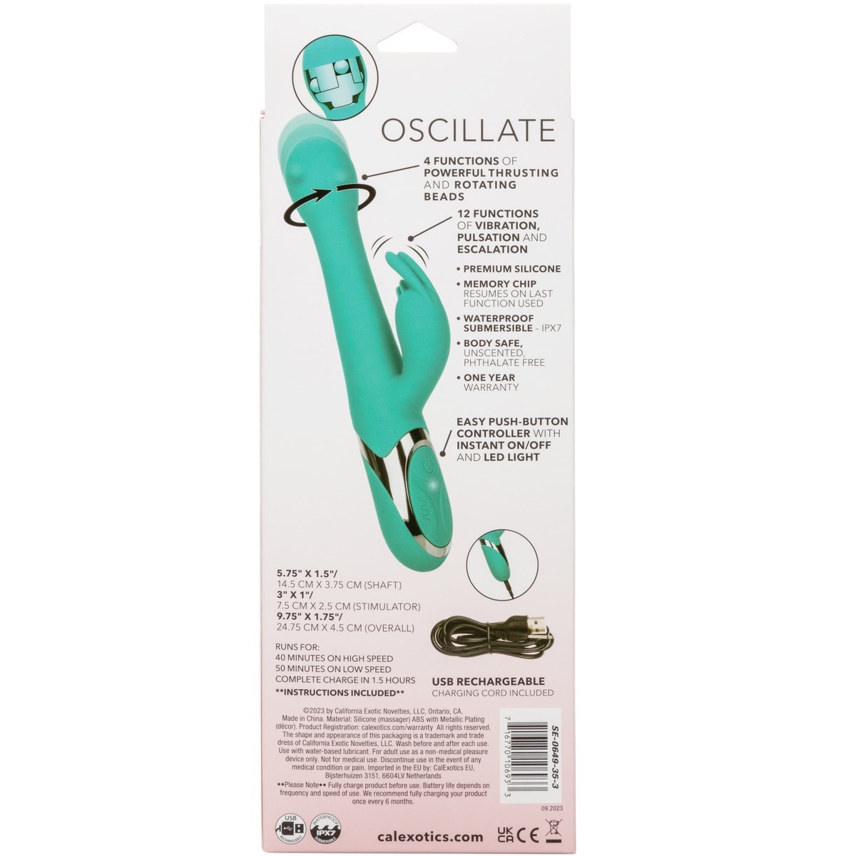 Вибратор «Enchanted Oscillate» с клиторальной стимуляцией, 12 режимов, бирюзовый, 24 см, силикон, USB-зарядка