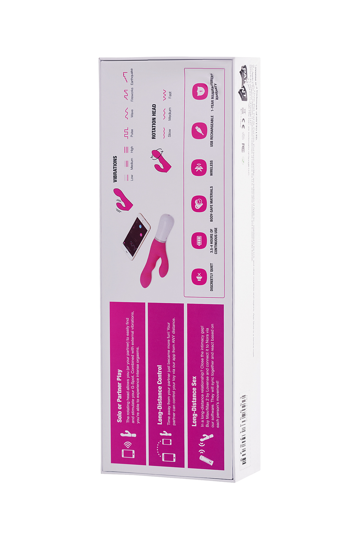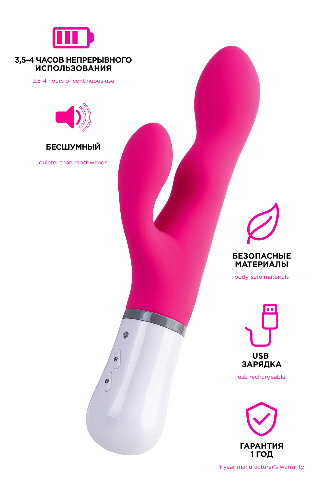 Изделие изготовлено из медицинского силикона, безопасного для тела, с гладкой приятной текстурой. Благодаря встроенному аккумулятору, устройство работает до 4 часов без подзарядки. Уровень шума минимален, что обеспечивает полную конфиденциальность.
