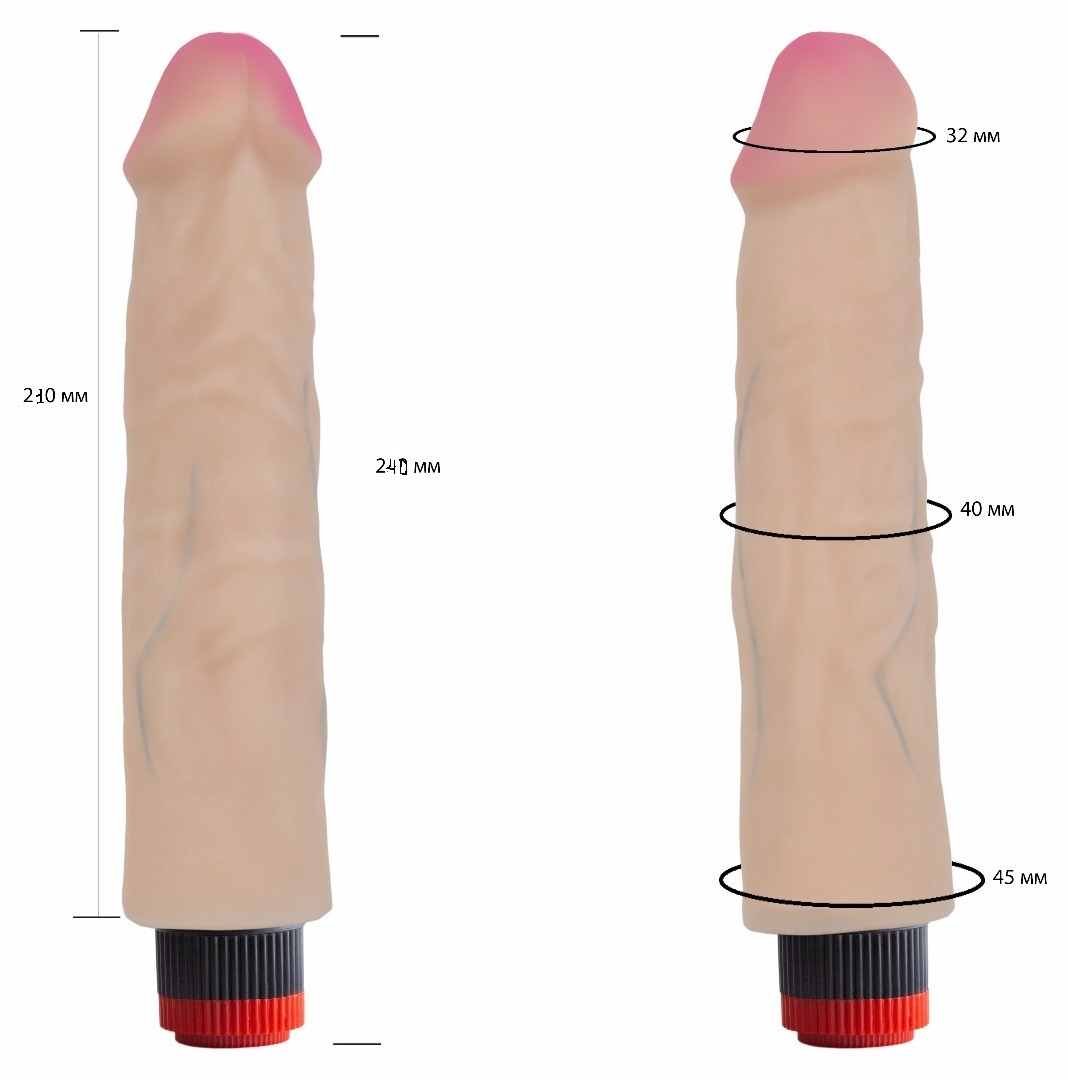 Общая длина – 24 см, рабочая длина – 21 см, диаметр – 4.5 см. Работает от 2 батареек типа AA (не входят в комплект). Цвет – телесный с розовым оттенком на кончике.