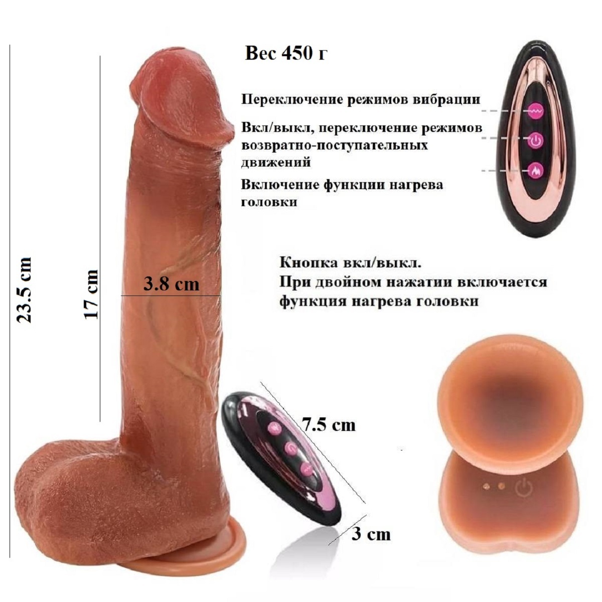 Вибратор реалистичный с подогревом до 42°C и ПДУ, 9 режимов вибрации, 3 скорости, присоска, 23,5 см