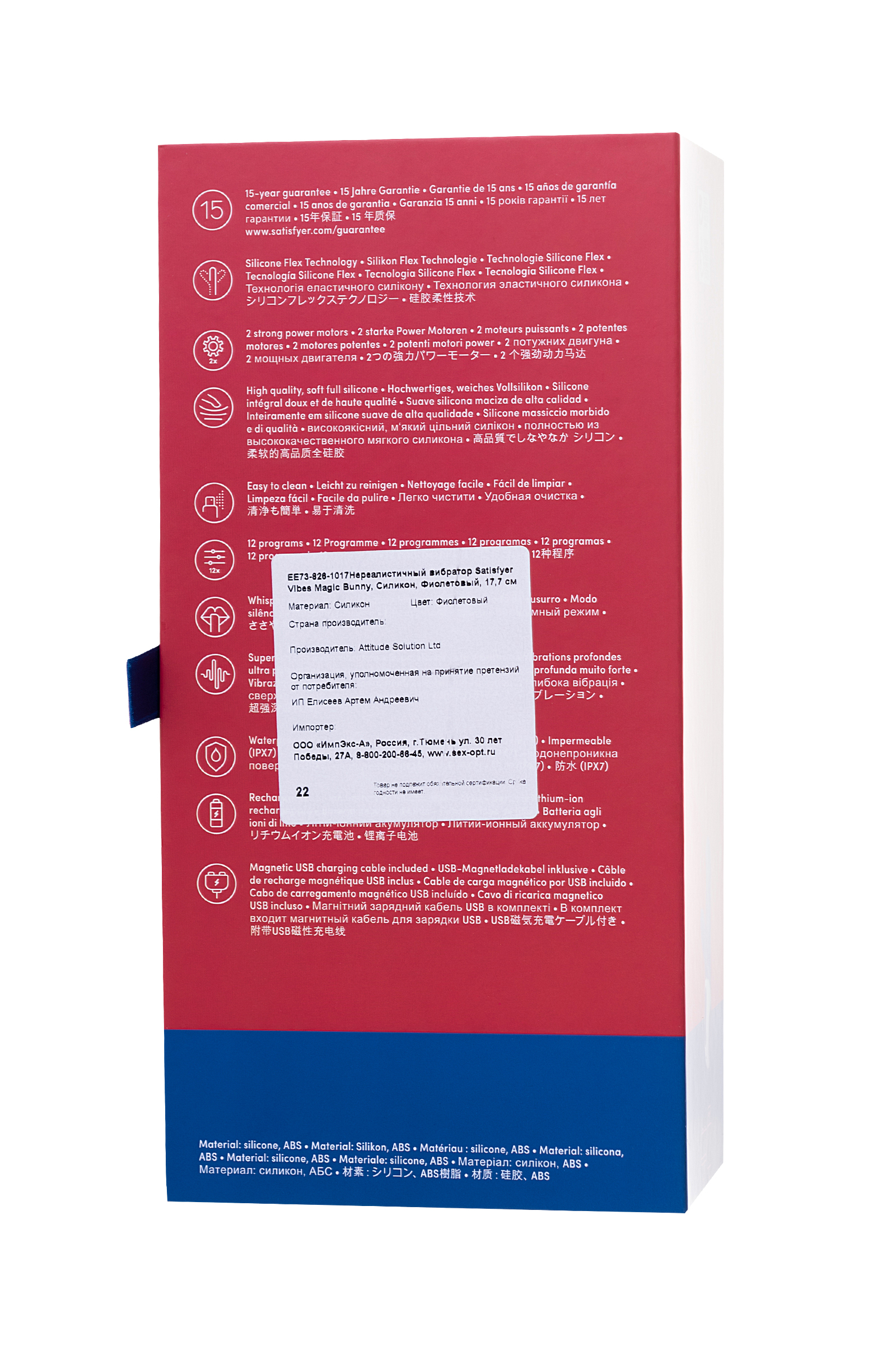 Гладкая поверхность из гипоаллергенного силикона легко очищается с помощью мыльного раствора. Магнитная зарядка обеспечивает полную герметичность — достаточно подключить кабель к контактам для 2 часов непрерывной работы.