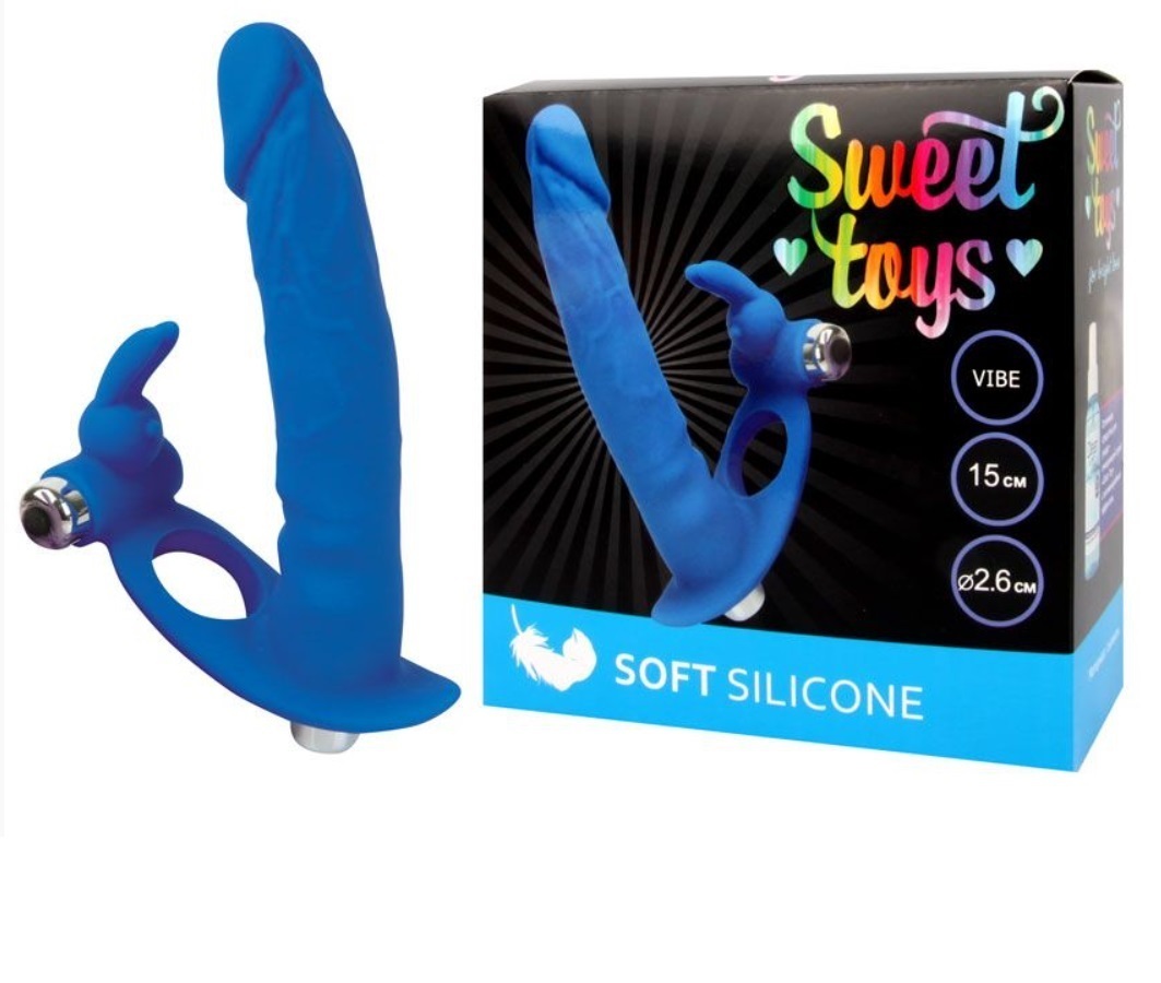 Вибромассажер Sweet Toys с клиторальным стимулятором, длина 15см, диаметр 2.6см, цвет синий