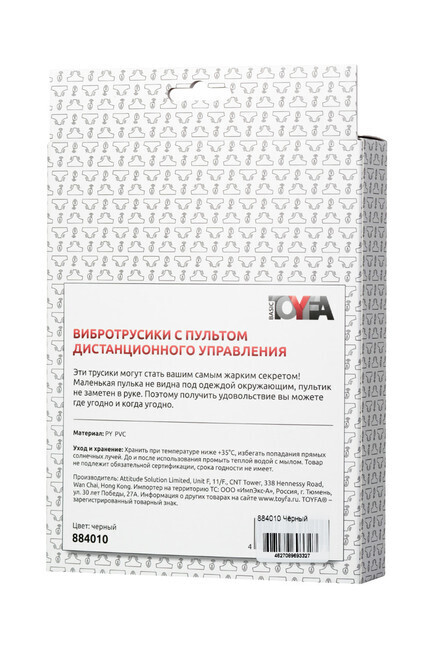 Полная комплектация: трусики черного цвета, пульт управления с батарейным отсеком. Произведено под контролем бренда TOYFA с соблюдением международных стандартов безопасности.