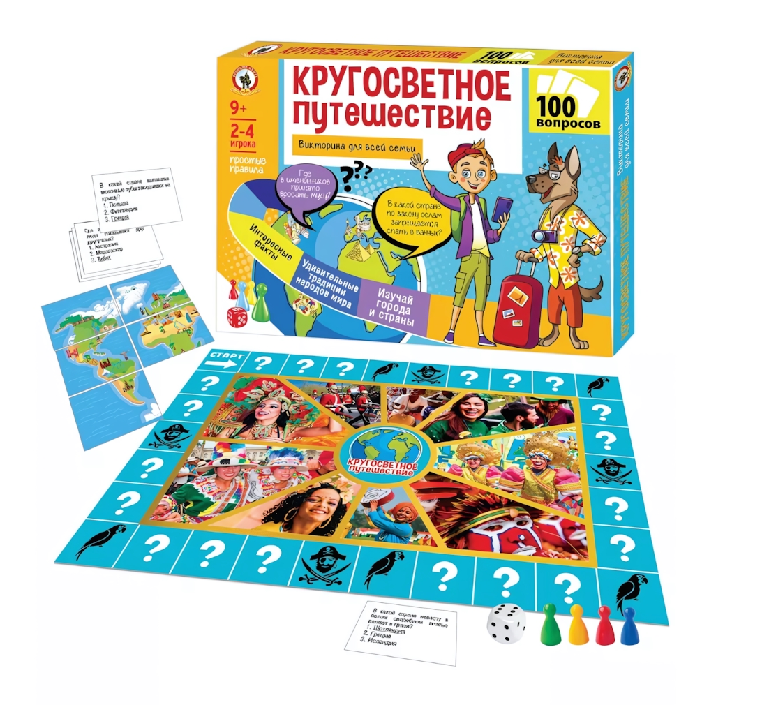 В комплект входят: игровое поле с яркими иллюстрациями, 100 карточек с вопросами, 4 игровые фишки и кубик. Игра изготовлена из качественного картона, что обеспечивает её долговечность. Рекомендуемый возраст для игроков — 9 лет и старше. Размеры компонентов не указаны, но они удобно помещаются в стандартной упаковке.