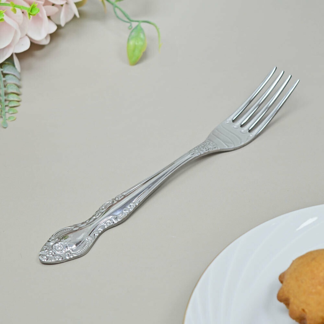 Эта десертная вилка сочетает в себе изящество и практичность, создавая атмосферу утонченности при каждом чаепитии или обеде. Серебристый блеск металла и аккуратный декоративный узор на ручке делают её не просто столовым прибором, а элементом сервировки, который привлекает внимание гостей.