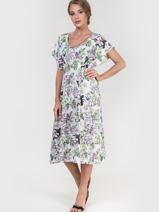 Платье представлено в размере XL. Цвет и конкретный вариант цветочного принта отгружаются в ассортименте. Это означает, что вы получите один товар, а конкретный рисунок (сочетание оттенков зелёного, розового, фиолетового, чёрного на белом фоне) будет определён случайным образом из доступных на складе. Модель на фото демонстрирует один из возможных вариантов расцветки.