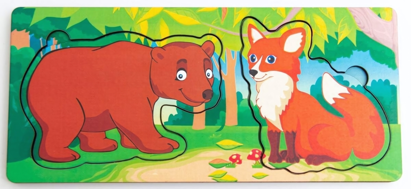 В комплекте: 1 деревянная панель с контурами, 6 фигурок животных (лиса, медведь и 4 детёныша). Все элементы прошли ручную шлифовку и окрашены безопасными красками на водной основе. Идеально подходит для домашнего использования и развивающих центров.