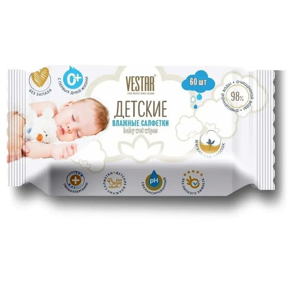 Детские влажные салфетки с тиснением, 60 шт, для чувствительной кожи, без запаха, 98% воды