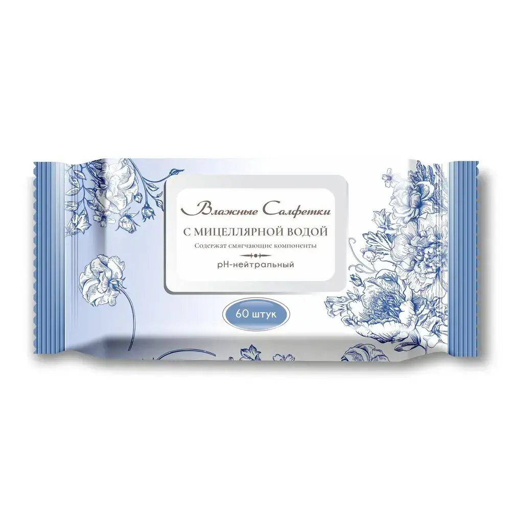 Влажные салфетки очищающие с мицеллярной водой, 60 шт, пластиковый клапан, pH-нейтральные