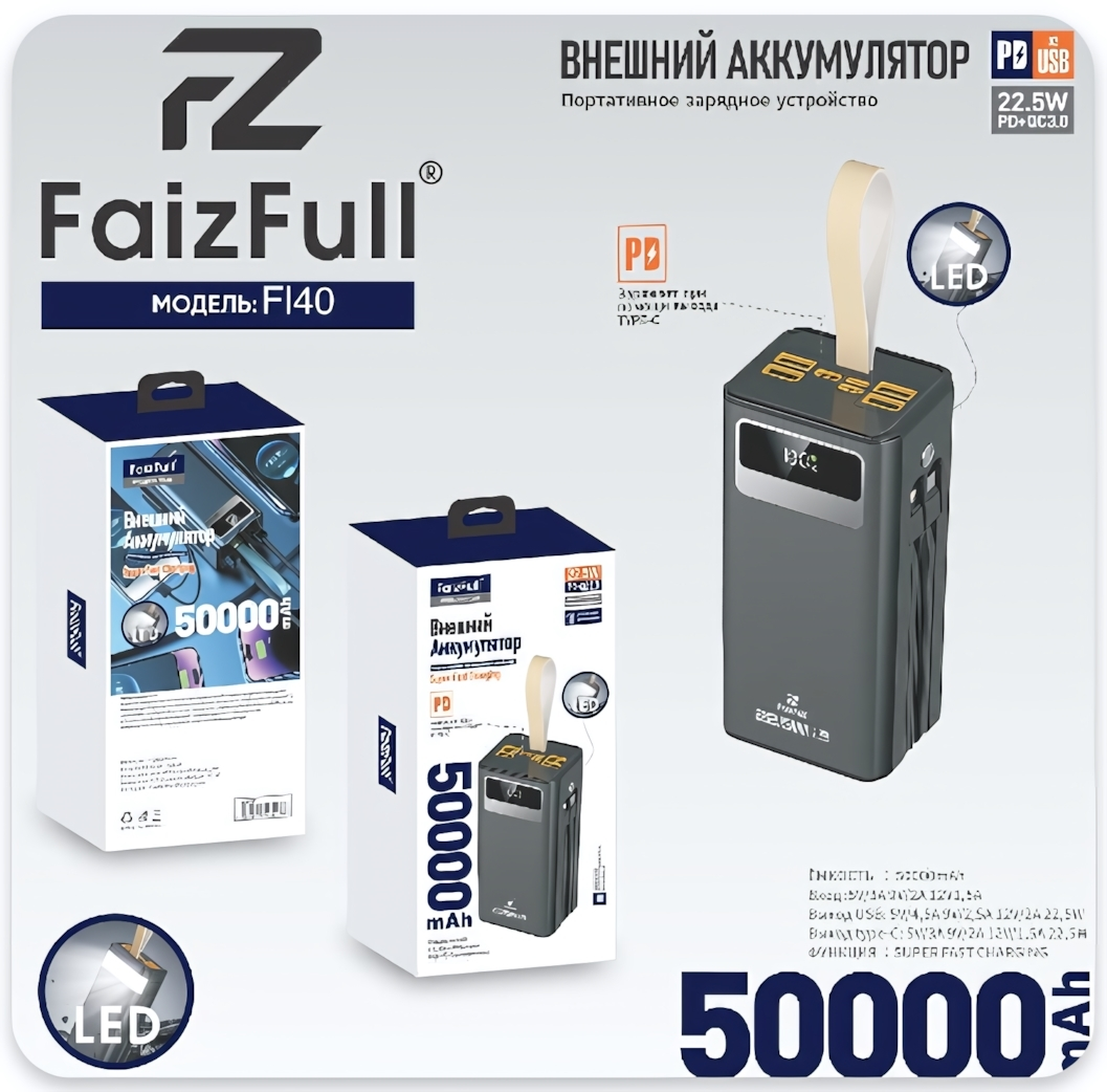 Представляем внешний аккумулятор FaizFull FL40 — ваш надежный источник энергии в дороге, на работе или путешествиях. С емкостью 50000mAh он способен зарядить смартфон до 10 раз или планшет несколько раз.