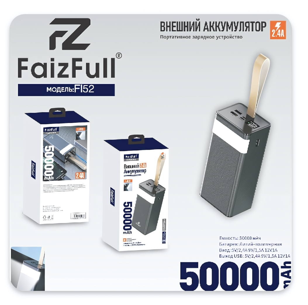 Почему стоит выбрать FaizFull FL52? Во-первых, его высокая емкость в 50000 мАч позволяет многократно заряжать ваши устройства без необходимости искать розетку. Во-вторых, выходное напряжение 5V, 9V и 12V с поддержкой 2.4A гарантирует быструю и безопасную зарядку. В-третьих, наличие дисплея позволяет контролировать уровень заряда, что добавляет удобства в использовании.