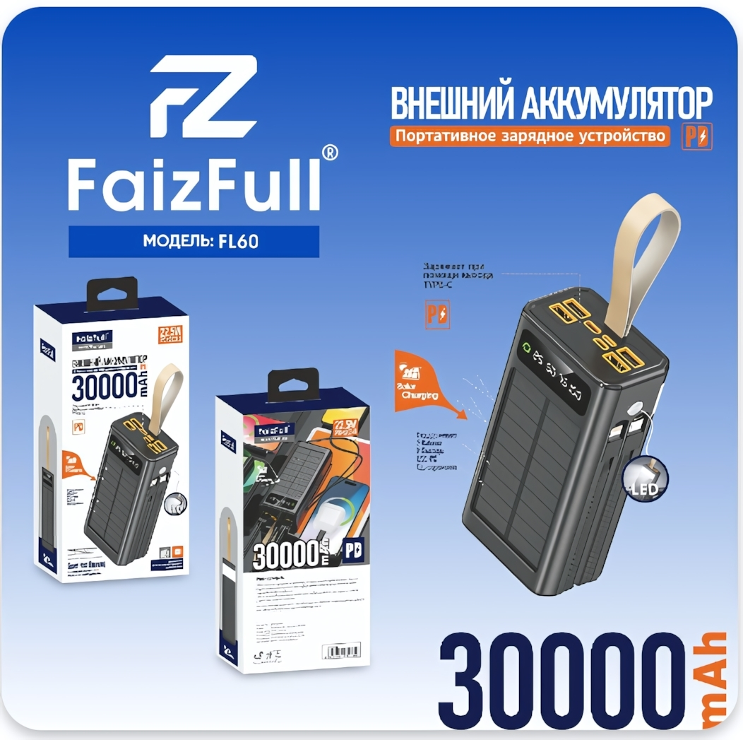 Представляем внешний аккумулятор FaizFull FL60 – ваш надежный источник энергии, который сочетает огромную емкость 30000mAh и инновационную солнечную зарядку. Идеальное решение для путешествий, походов и повседневного использования.